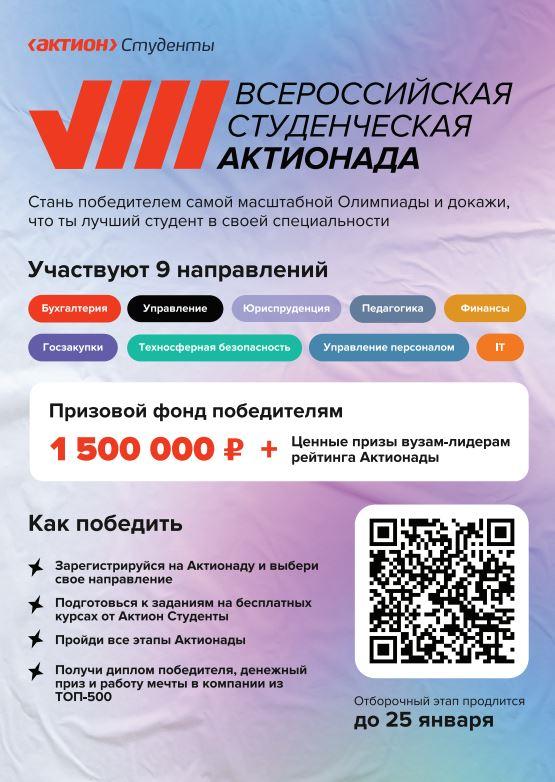 Всероссийская студенческая Актионада - это олимпиада, рассчитанная на студентов колледжей и вузов. Победители получат денежные призы и возможность пройти стажировки в ведущих компаниях России.