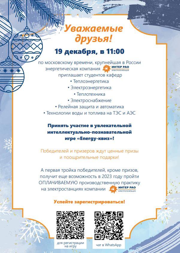 19 декабря в 11:00 крупнейшая в России энергетическая компания ИНТЕР РАО Электрогенерация приглашает студентов принять участие в увлекательной интеллектуально-познавательной игре «Energy-квиз».