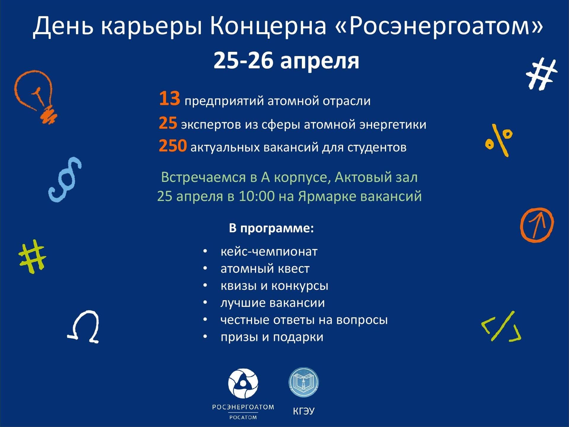 25-25 апреля в Казанском государственном энергетическом университете пройдут карьерные мероприятия, где студенты смогут встретиться и задать вопросы о трудоустройстве представителям 13-ти предприятий атомной отрасли!