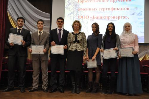 Начальник Департамента управления персоналом ОАО "Башкирская электросетевая компания" Ю.А. Казанская вручила сертификаты именных стипендий ООО «Башкирэнерго» студентам Энергоуниверситета.