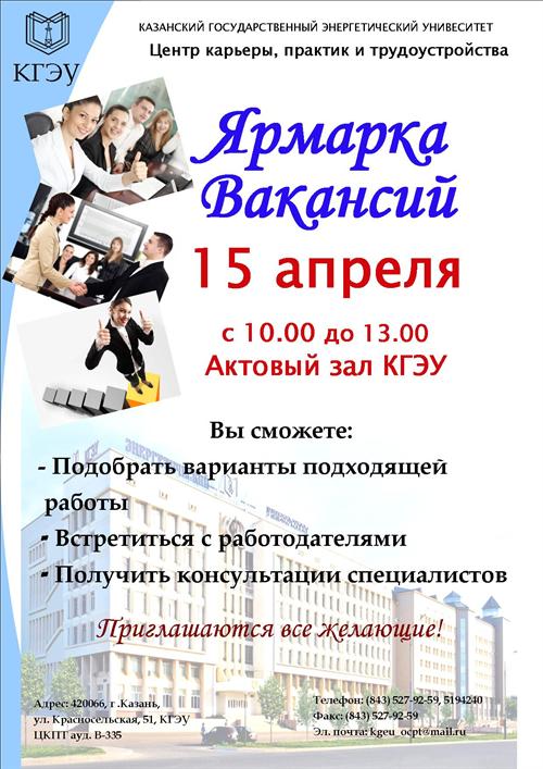Приглашаем Вас 15 апреля в 10.00 в Актовый зал КГЭУ на ЯРМАРКУ ВАКАНСИЙ!