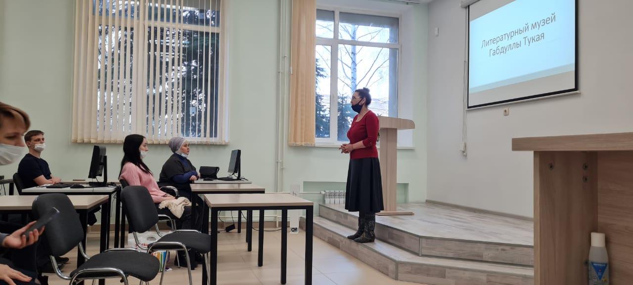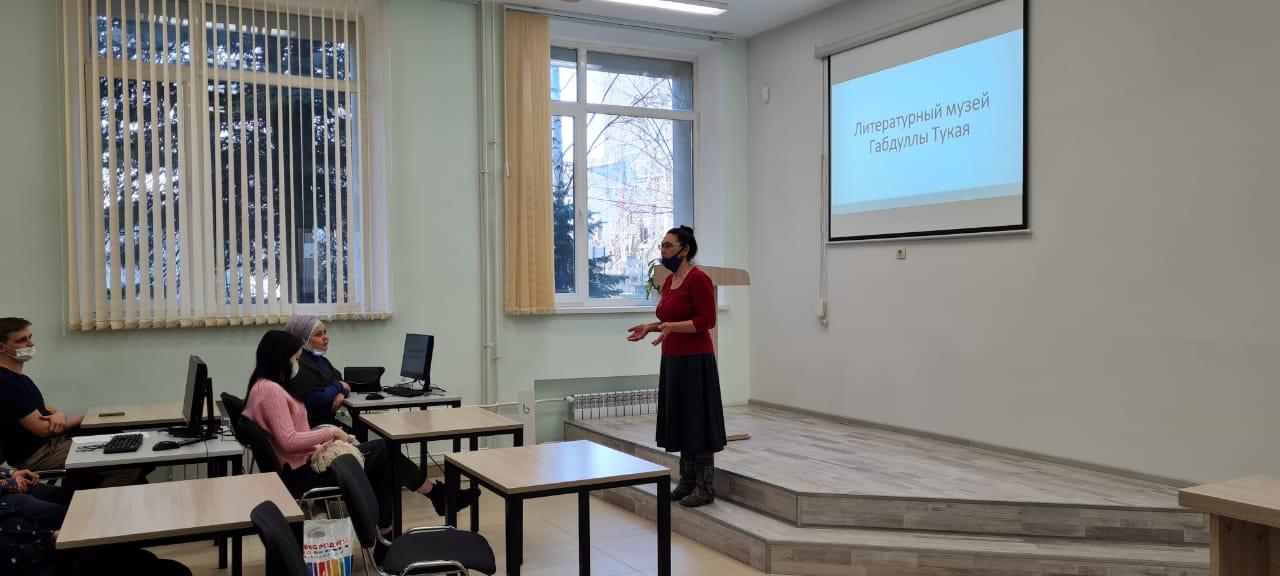 Лена Ивановна Тябина выступила перед студентами с презентацией, ознакомила слушателей с обновленным музеем и рассказала об интересных фактах из жизни поэта, о личных вещах, раннее принадлежащих  Тукаю, которые стали уникальными экспонатами музея. Свое выступление она закончила строками из стихотворения поэта:
