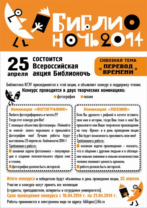 25 апреля состоится Всероссийская акция "Библионочь-2014". Библиотека КГЭУ присоединяется к этой акции, и объявляет конкурс в поддержку чтения.