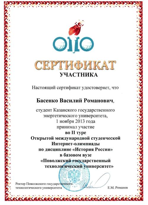 По результатам второго тура Василий Романович Басенко (гр. ЭЭ-7-13) – занял третье место по региону и получил грамоту. Остальные студенты КГЭУ (Валерия Равилевна Мамеева, гр. ДВУ-1-11;  Мария Александровна Соколова, гр. ДВУ-1-11; Екатерина Сергеевна Фонакова, гр. ДВУ-1-11; Георгий Раджиевич Алиев, гр. ЭЭ-7-13; Адель Фанисович Гайнутдинов, гр. ЭЭ-7-13; Павел Юрьевич Москвин, гр. ЭКП-4-13;  Айсылу Айратовна Мубаракшина, гр. 4-13; Язиля Ильдаровна Сафиуллина, гр. 4-13) получили сертификаты участников Интернет-Олимпиады.
