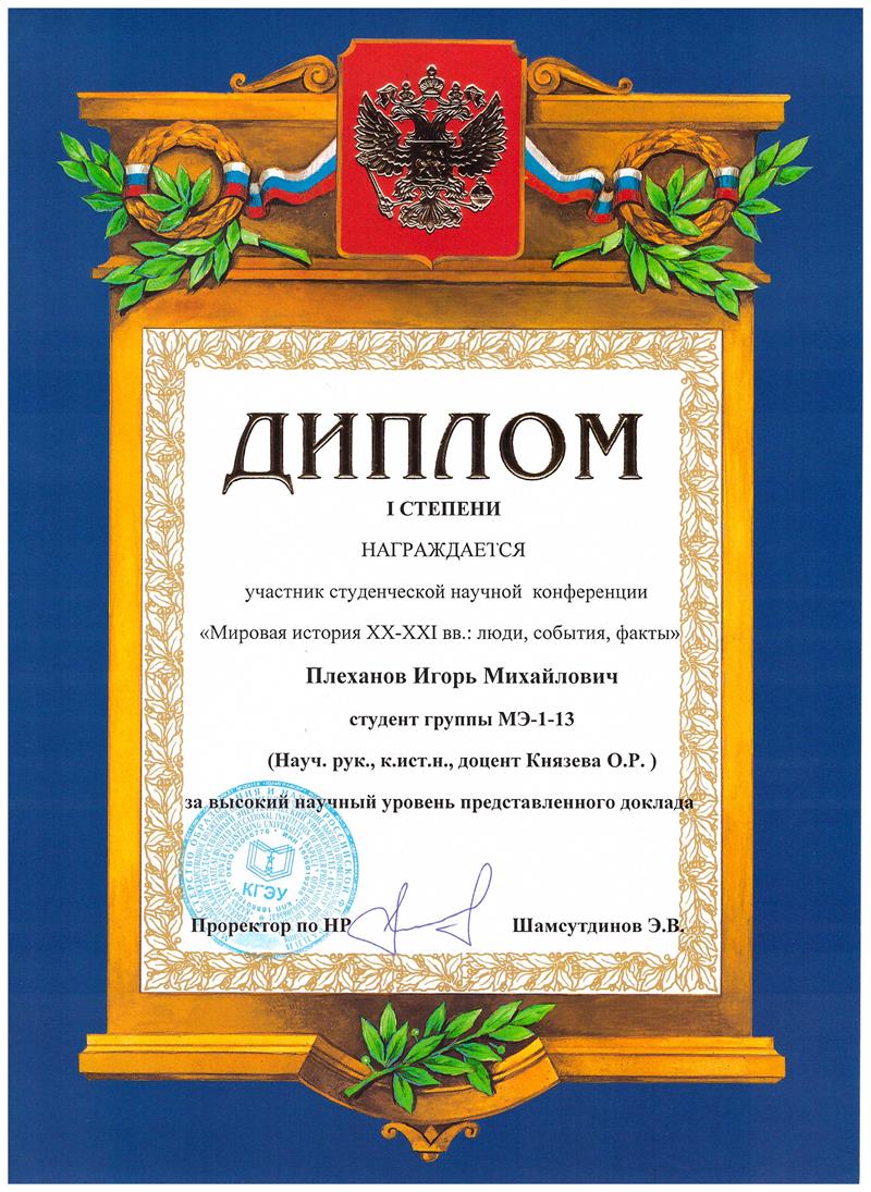 21-29 апреля 2014 г. кафедра "История" КГЭУ провела научную студенческую конференцию по теме: "Мировая история XX-XXI .: люди, события, факты", проводитвшаяся среди студентов первого курса всех профилей и направлений. Показавшие высокий результат, были отмечены дипломами.