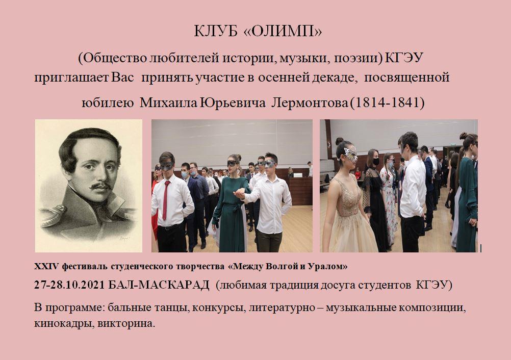КЛУБ «ОЛИМП» (Общество любителей истории, музыки, поэзии) КГЭУ приглашает принять участие в осенней декаде, посвященной 180-летию со дня кончины Михаила Юрьевича Лермонтова (1814-1841).