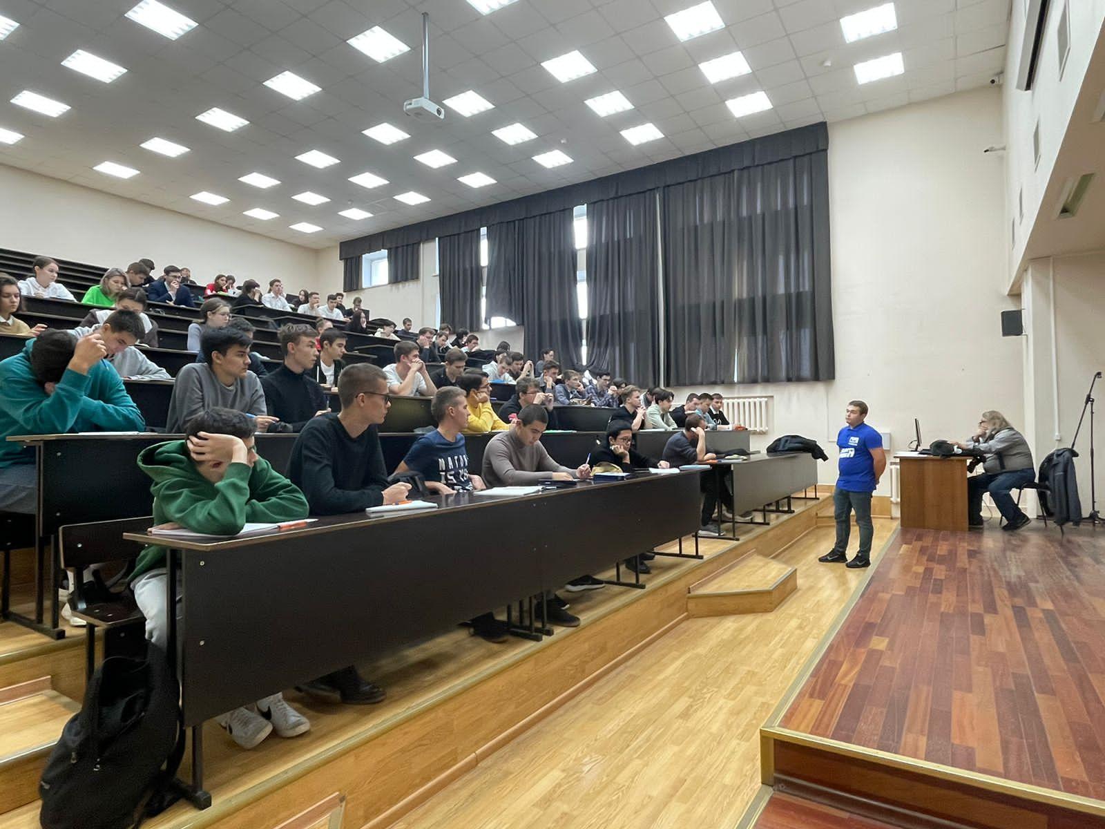 Владислав Тарасов выступил также перед студентами на потоковых лекциях и пригласил всех желающих вступать в ряды добровольцев Гуманитарного штаба «#МыВместе».