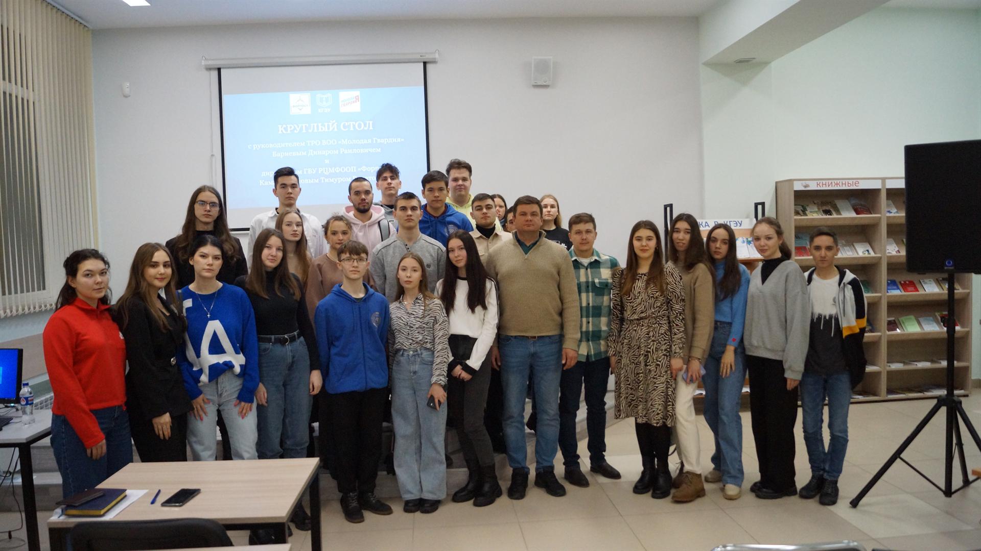 9 февраля в читальном зале библиотеки КГЭУ состоялся круглый стол студенческого актива с руководителем Регионального штаба ТРО ВОО «Молодая Гвардия» Динаром Бариевым и с директором Республиканского центра молодежных формирований по охране общественного порядка «Форпост» Тимуром Камалетдиновым