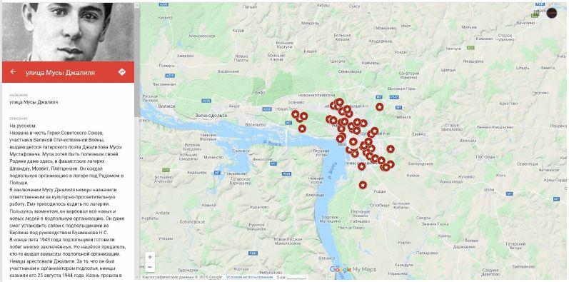 Ещё в школе Тимур увлёкся проектом, который позволяет увидеть на карте Казани места, связанные с именами знаменитых земляков и людей, в чьих судьбах наш город оставил заметный след. Например, человек, находящийся на улице имени Мусы Джалиля, видит на онлайн-карте свое местоположение, а, нажав на специальный значок, может получает информацию о поэте-герое на татарском, русском и английском языках.