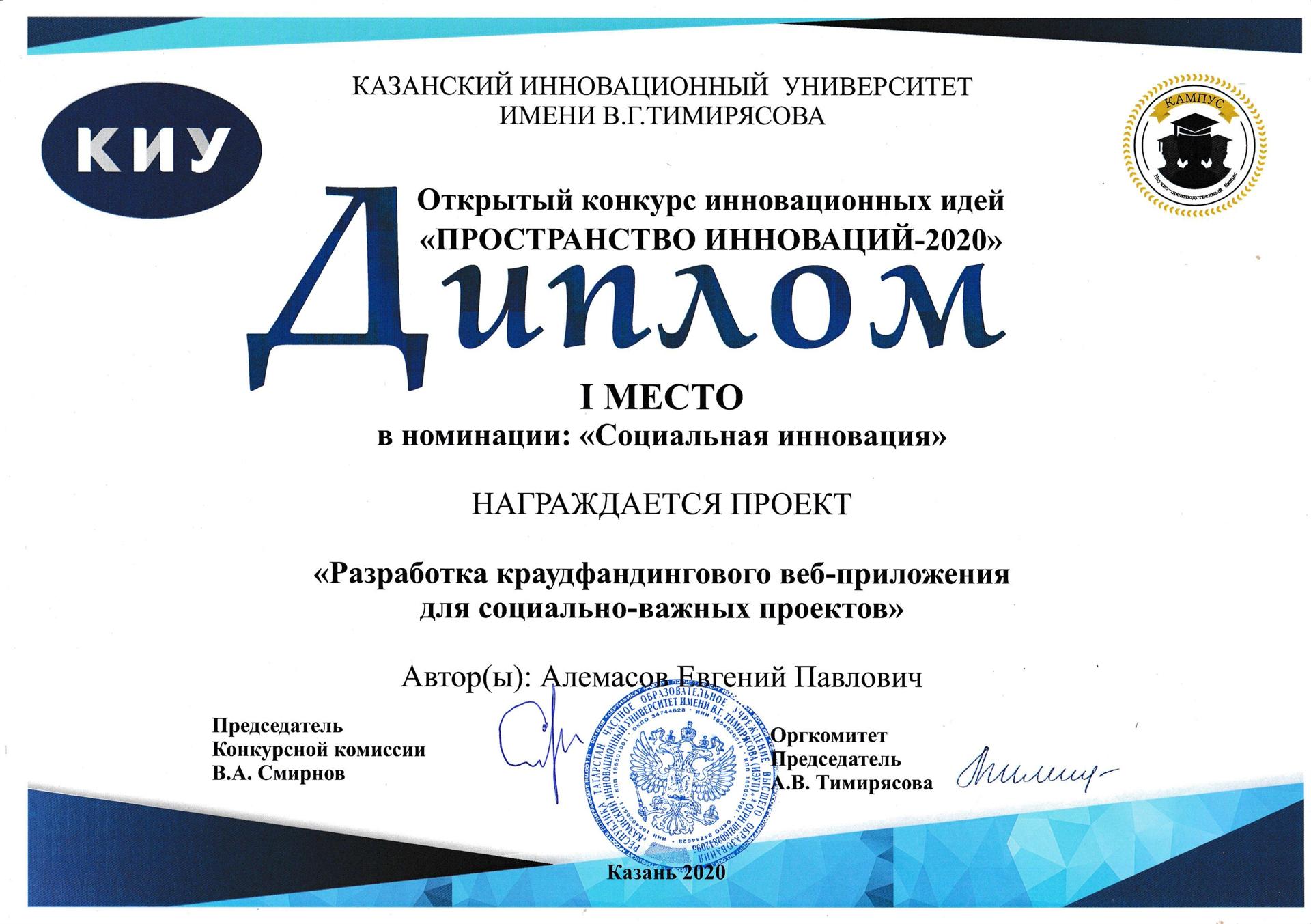Студент группы ПМ-1-19 Евгений Алемасов занял I место в номинации «Социальная инновация» в конкурсе инновационных идей «Пространство инноваций-2020».