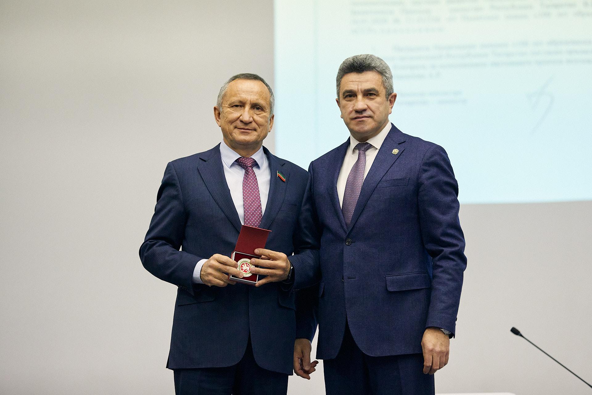 Министр образования и науки РТ Ильсур Хадиуллин вручил ректору КГЭУ Эдварду Абдуллазянову памятный знак «100 лет образования Татарской АССР».