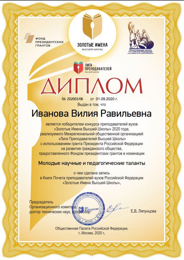 Доцент кафедры ЭХП Вилия Иванова одержала победу в конкурсе "Золотые имена высшей школы" 2020 года в номинации "Молодые научные и педагогические таланты".