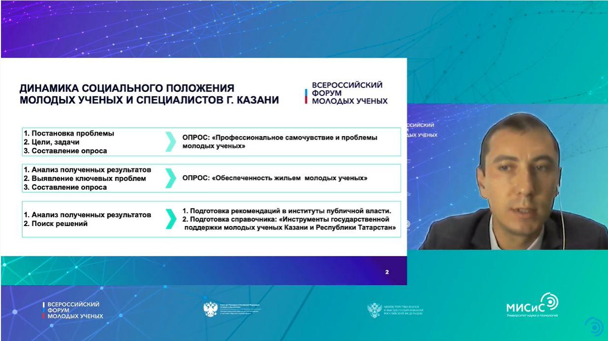 Доцент кафедры «Промышленная теплоэнергетика и системы теплоснабжения» КГЭУ – председатель Совета молодых ученых и специалистов Казани Сергей Гапоненко рассказал о практике взаимодействия организации с органами власти Татарстана в решении социальных проблем молодых ученых в республике. Он сообщил, что СМУС Казани организовал и провел опросы с целью определить профессиональное самочувствие и выявить проблемы, с которыми чаще всего сталкиваются молодые ученые.