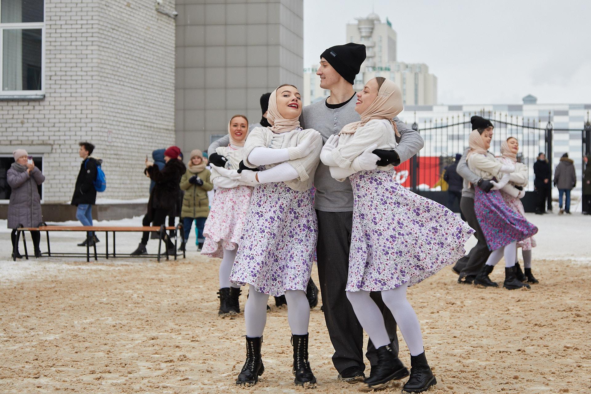 Несмотря на зимний холод в этот весенний день, атмосфера на празднике оставалась тепой и душевной. Артисты «зажигали» на импровизированной сцене, а зрители подтанцовывали артистам и разогревались горячим чаем с выпечкой и кашей, приготовленной в полевой кухне.