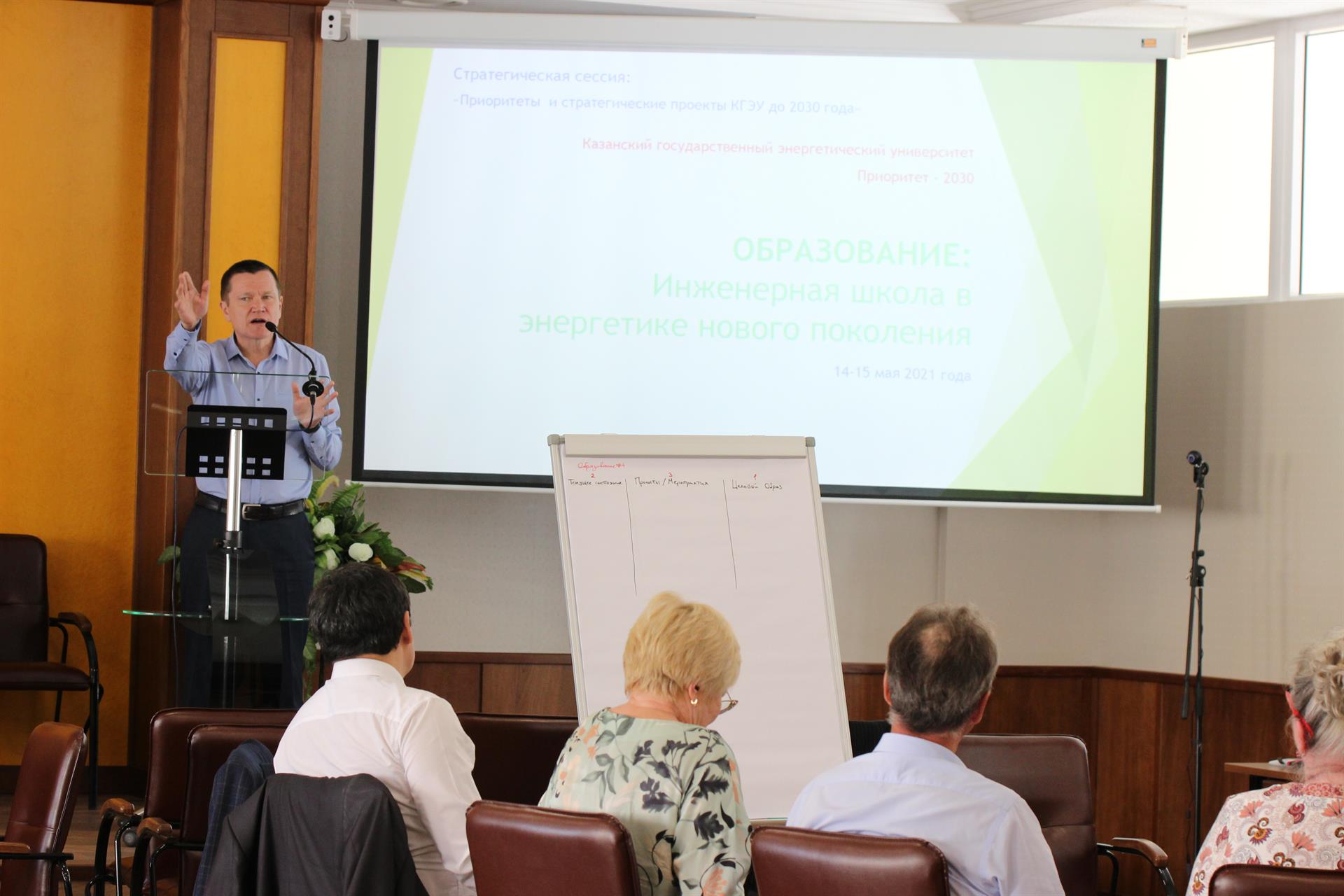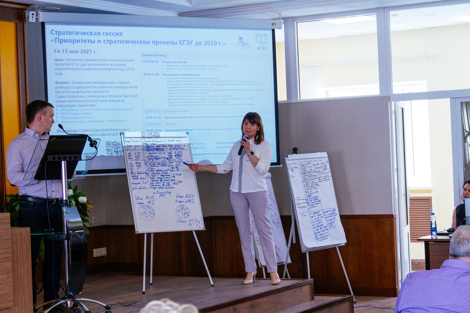 В течение двух дней состоялась серия проектных семинаров в формате fast track по следующим тематикам: инженерная школа в энергетике нового поколения; КГЭУ Energy Initiative (стратегия НИОКР и коммерциализации); третья миссия КГЭУ; новые подходы к управлению университетом. В рамках проектных семинаров проходило коллективное обсуждение в мини-группах последующим представлением результатов на общем заседании. В рамках общих заседаний организационный помощник фиксировал основные идеи и выводил их на экран. В работе семинаров приняли участие индустриальные партнеры КГЭУ.