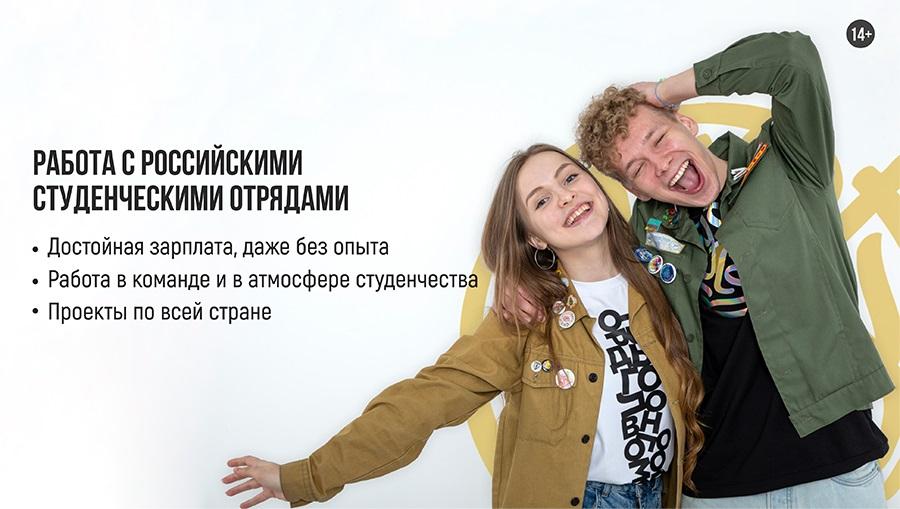 Работая в составе студенческого отряда, вы получаете официальное трудоустройство и «белую» зарплату. Существует система компенсаций затрат на проезд и проживание от работодателя, можно получить дополнительную рабочую специальность, что повысит вашу конкурентоспособность на рынке труда.