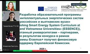 14 мая 2020 года в онлайн режиме прошла информационная сессия о наборе на англоязычную программу «Интеллектуальные энергетические системы», которая разработана в рамках проекта «Разработка образовательной программы в области интеллектуальных энергетических систем в российских и вьетнамских вузах» («Establishing Smart Energy System Curriculum at Russian and Vietnamese Universities (ESSENCE)») по программе «Erasmus +».