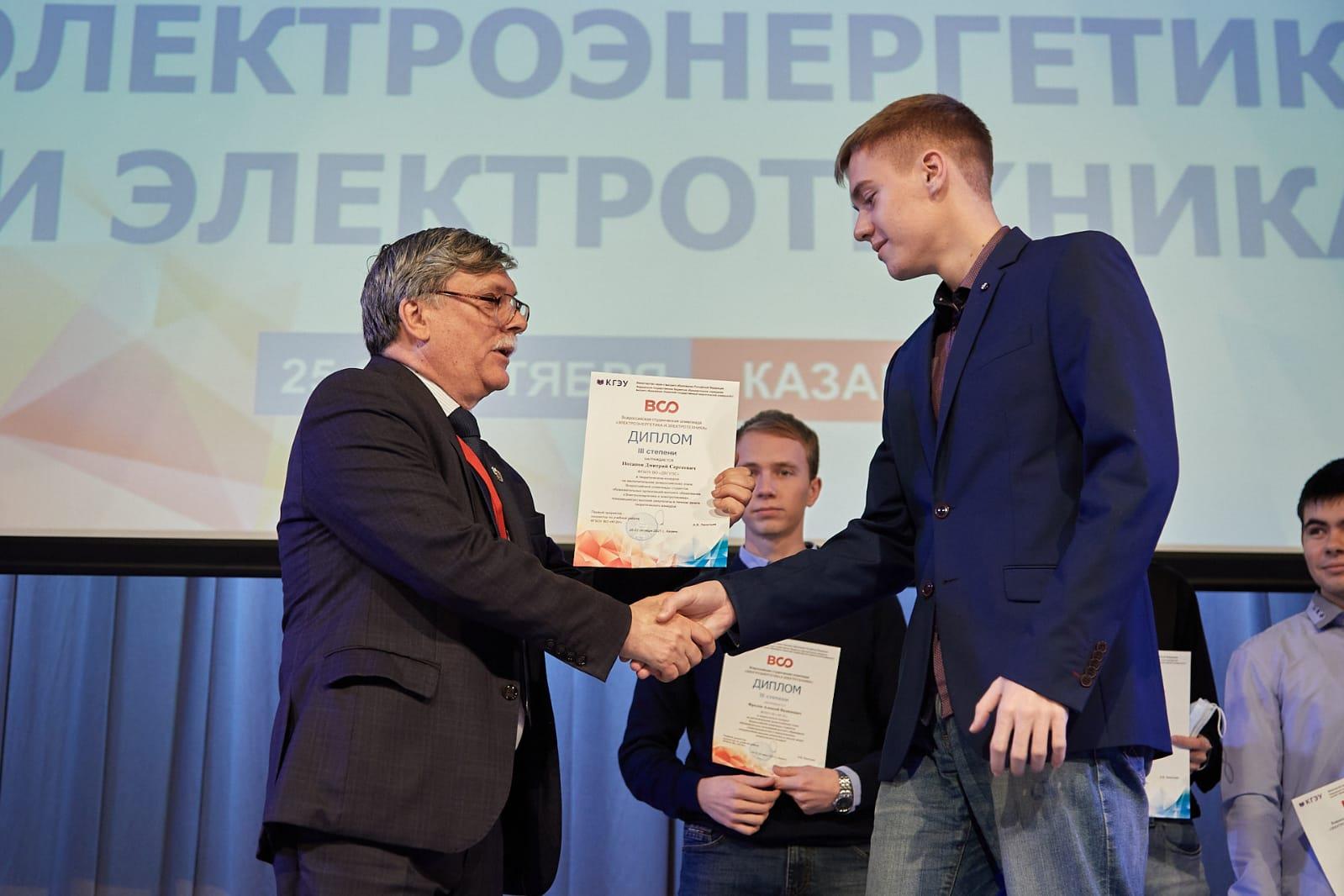 Дипломы участникам олимпиады, имеющим высокие результаты теоретического конкурса в личном зачете, вручил председатель жюри-заведующий кафедрой «Электроснабжение промышленных предприятий и электротехнологий» НИУ "МЭИ", председатель Учебно-методической комиссии вузов России по профилю «Электрооборудование и электрохозяйство предприятий, организаций и учреждений» Сергей Цырук. Кроме того, были награждены участники олимпиады, имеющие самые лучшие результаты среди участников своей команды.