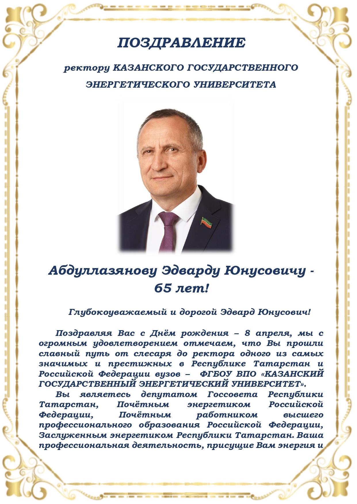 8 апреля отмечает юбилей ректор КГЭУ, депутат Государственного совета РТ Эдвард Юнусович Абдуллазянов.