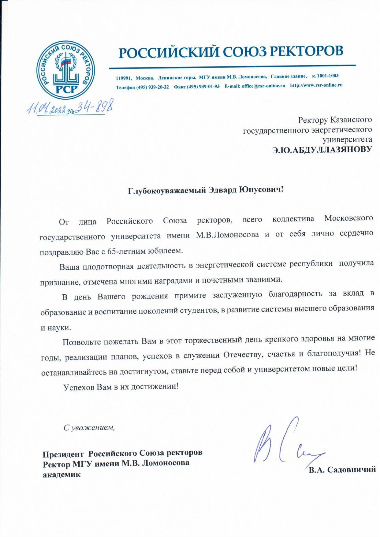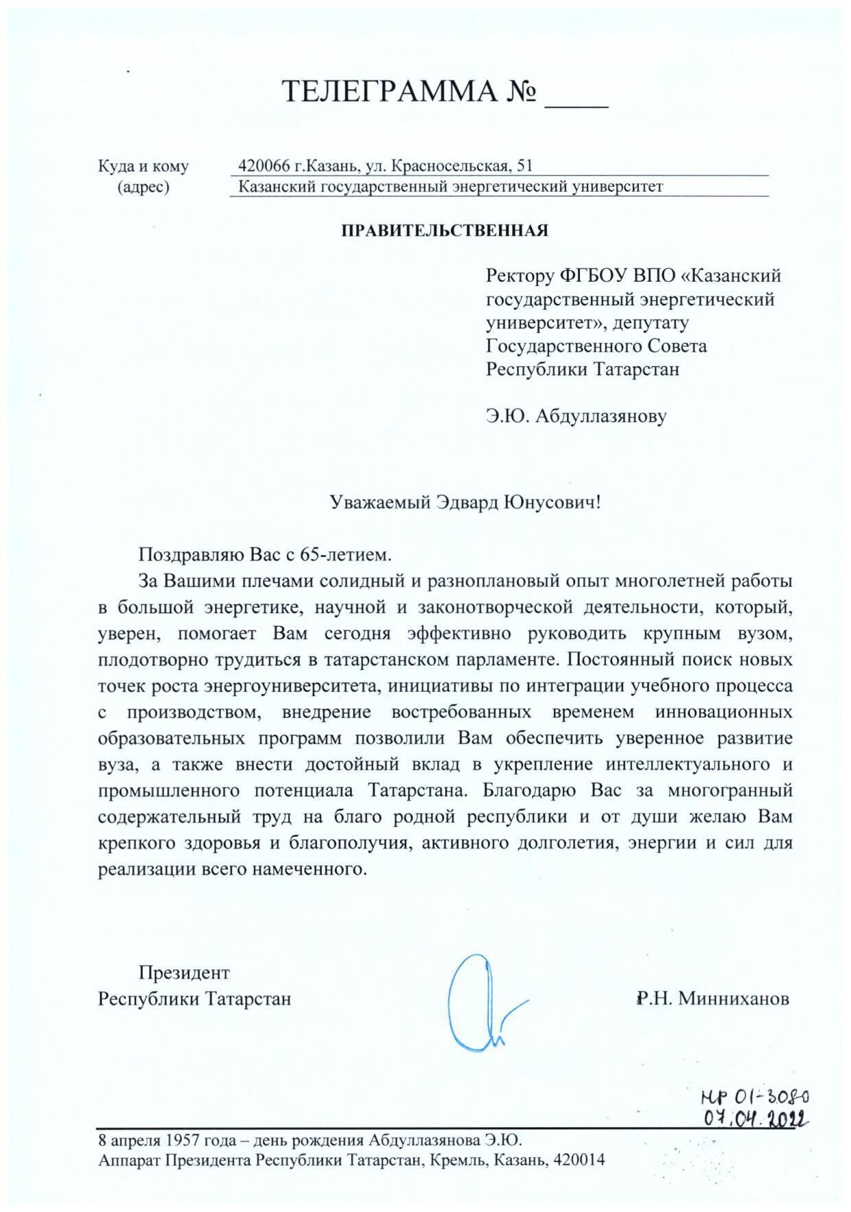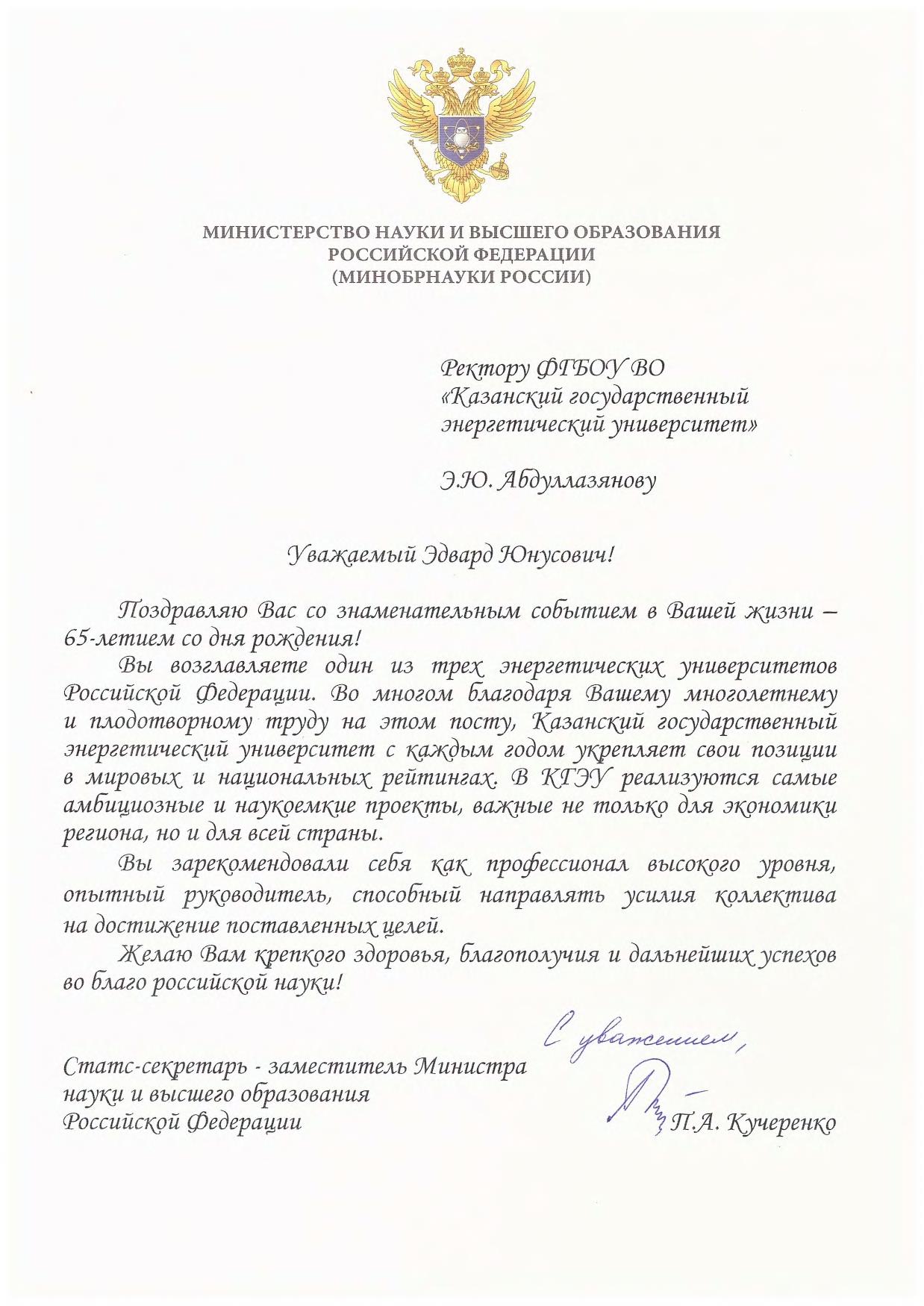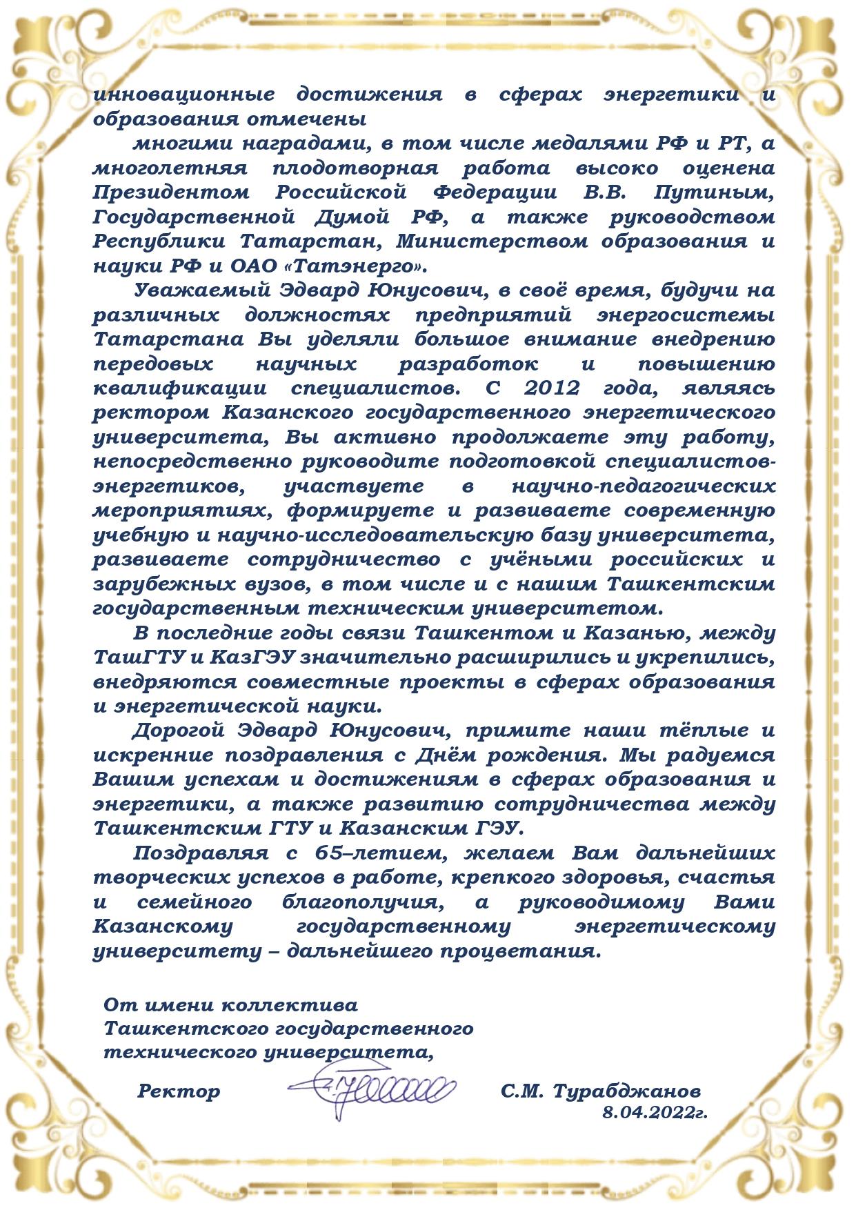 Коллектив КГЭУ сердечно поздравляет Вас с юбилеем! Вы более 10 лет возглавляете наш университет, и за это время он заметно преобразился.  КГЭУ сохранил статус самостоятельного вуза, возведены два новых общежития, создаются современные лаборатории, реализуются прорывные научно-образовательные проекты. Ваше трудолюбие и целеустремленность, направленные на высокий результат, всегда будут вызывать уважение со стороны всей нашей команды. Желаем Вам крепкого здоровья, успехов, благополучия и новых достижений! Пусть рядом с Вами всегда будут друзья и единомышленники, пусть Вас окружает любовь и забота близких!
