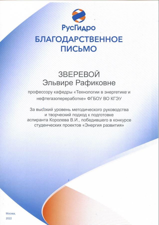Торжественная церемония награждения состоялась 28 апреля в московском офисе компании. Аспирант КГЭУ Владислав Королев стал победителем конкурса с проектом «Отход химводоподготовки предприятий ТЭК при обработке осадков сточных вод как «ингибитор-стимулятор» обеспечивающий дезинвазию осадка». Руководителю проекта - профессору кафедры «Технологии в энергетике и нефтегазопереработке» Эльвире Зверевой вручили благодарственное письмо от компании «РусГидро».