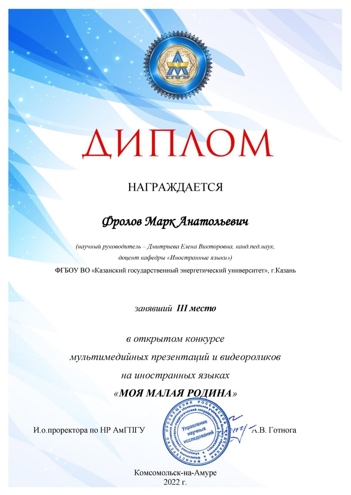 Студенты Казанского государственного энергетического университета принимали участие в Открытом Конкурсе мультимедийных презентаций и видеороликов на иностранных языках на тему "МОЯ МАЛАЯ РОДИНА". Студент группы ЭС-1-21 Марк Фролов занял третье место. Научным руководителем проекта выступила кандидат педагогических наук, доцент кафедры иностранных языков КГЭУ Елена Дмитриева.