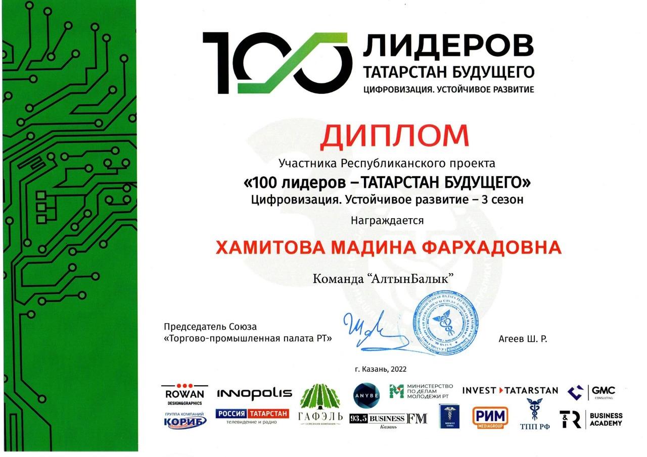 «100 лидеров ¬— Татарстан будущего» — проект Торгово-промышленной палаты РТ, ориентированный на молодежь и направленный на привлечение одаренных, активных молодых людей к предпринимательской деятельности. Темой в этом году стала «Цифровизация. Устойчивое развитие».Учеба проходила больше 4 месяцев. Участники прослушали базовые навыки по развитию проектов, слушали лекции по стратегии управлении и реализации проектов.