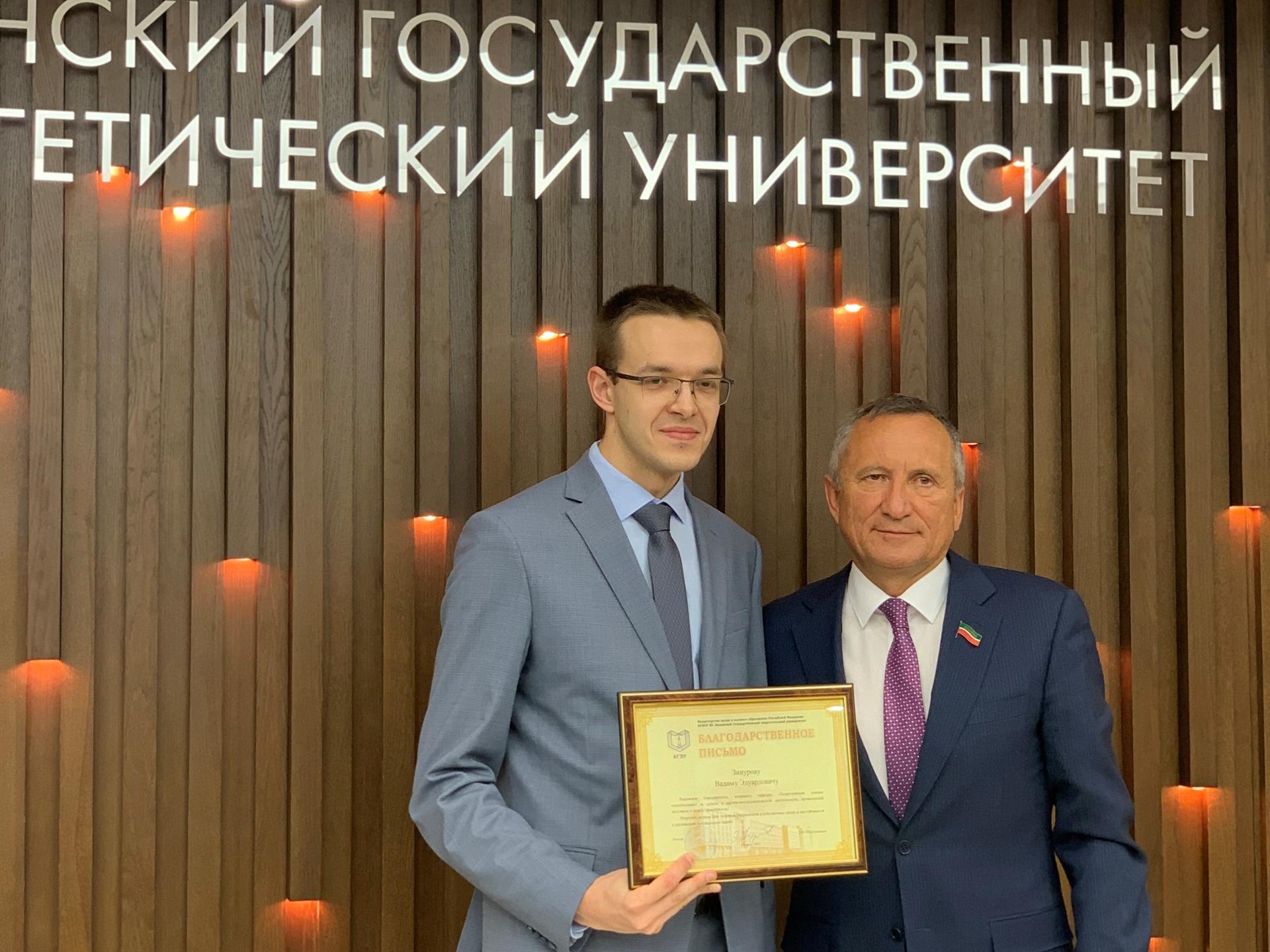 В рамках мероприятия ректор КГЭУ Эдвард Абдуллазянов вручил награды. Почетной грамотой КГЭУ за добросовестный труд в системе профессионального образования отмечен Айдар Хайруллин - аспирант 2 курса, кафедры ЭОС. Он является исполнителем двух грантов РНФ, ведет хоздоговорные работы с представителями реального сектора экономики, имеет 54 публикации в ведущих научных изданиях, три патента на полезную модель и 22 статьи в РИНЦ.
