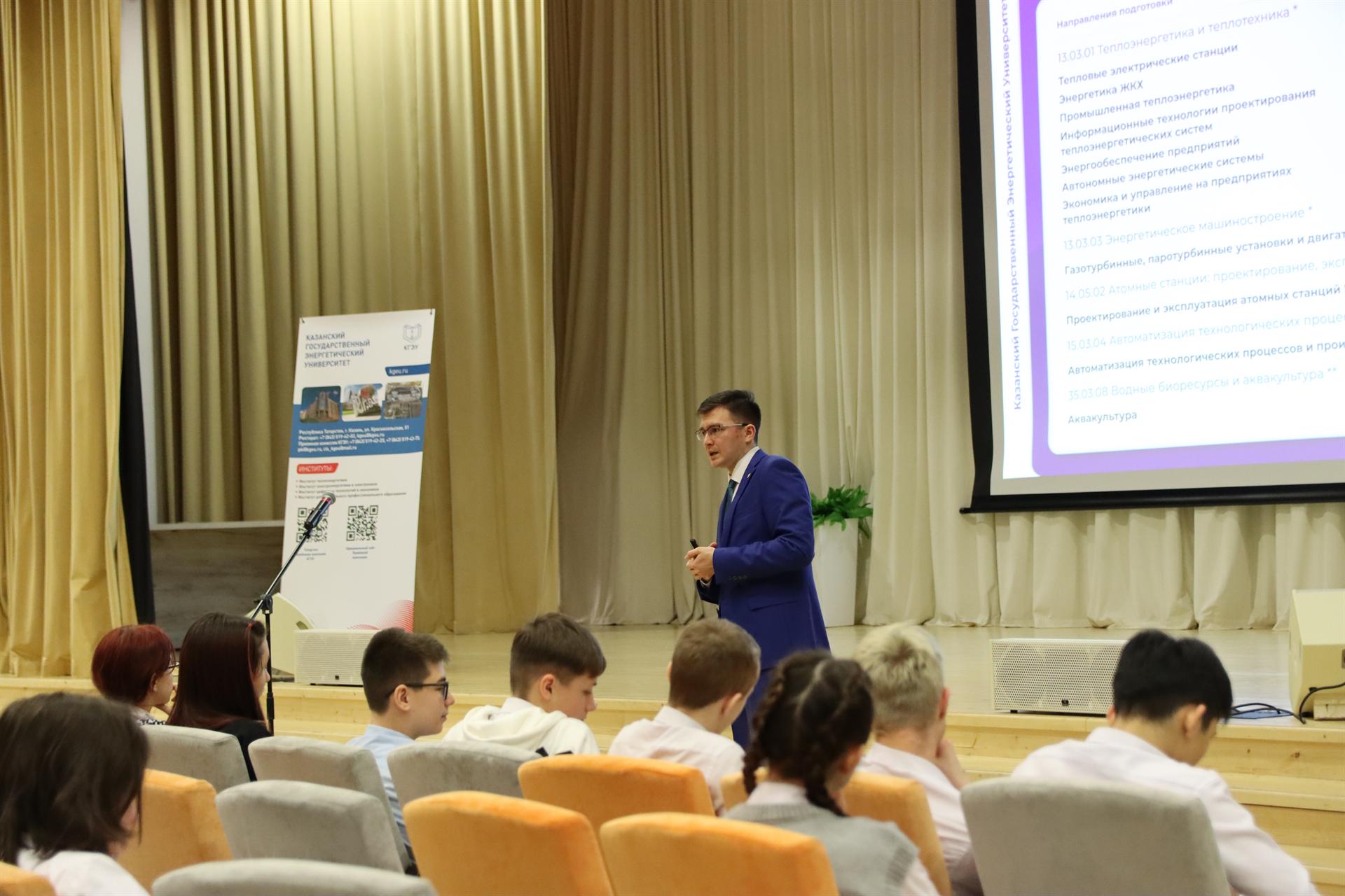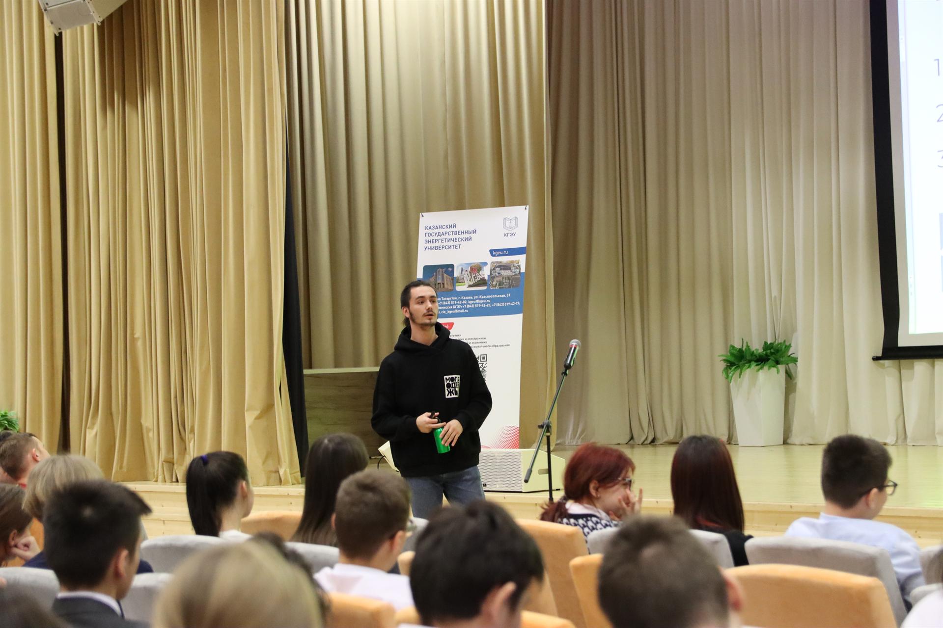 В конце урока руководитель волонтерского центра КГЭУ Андрей Коломиец и руководитель спортивного клуба Илья Мазилин поделились со  школьниками своими впечатлениями от учебы и занятий внеучебной деятельностью в Казанском государственном энергетическом университете.