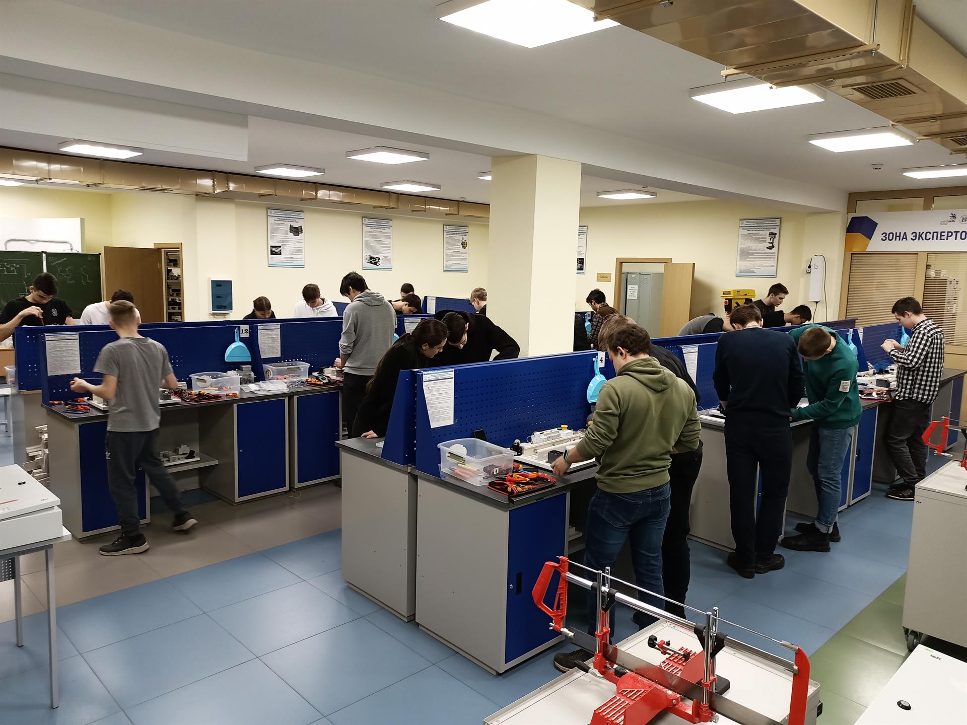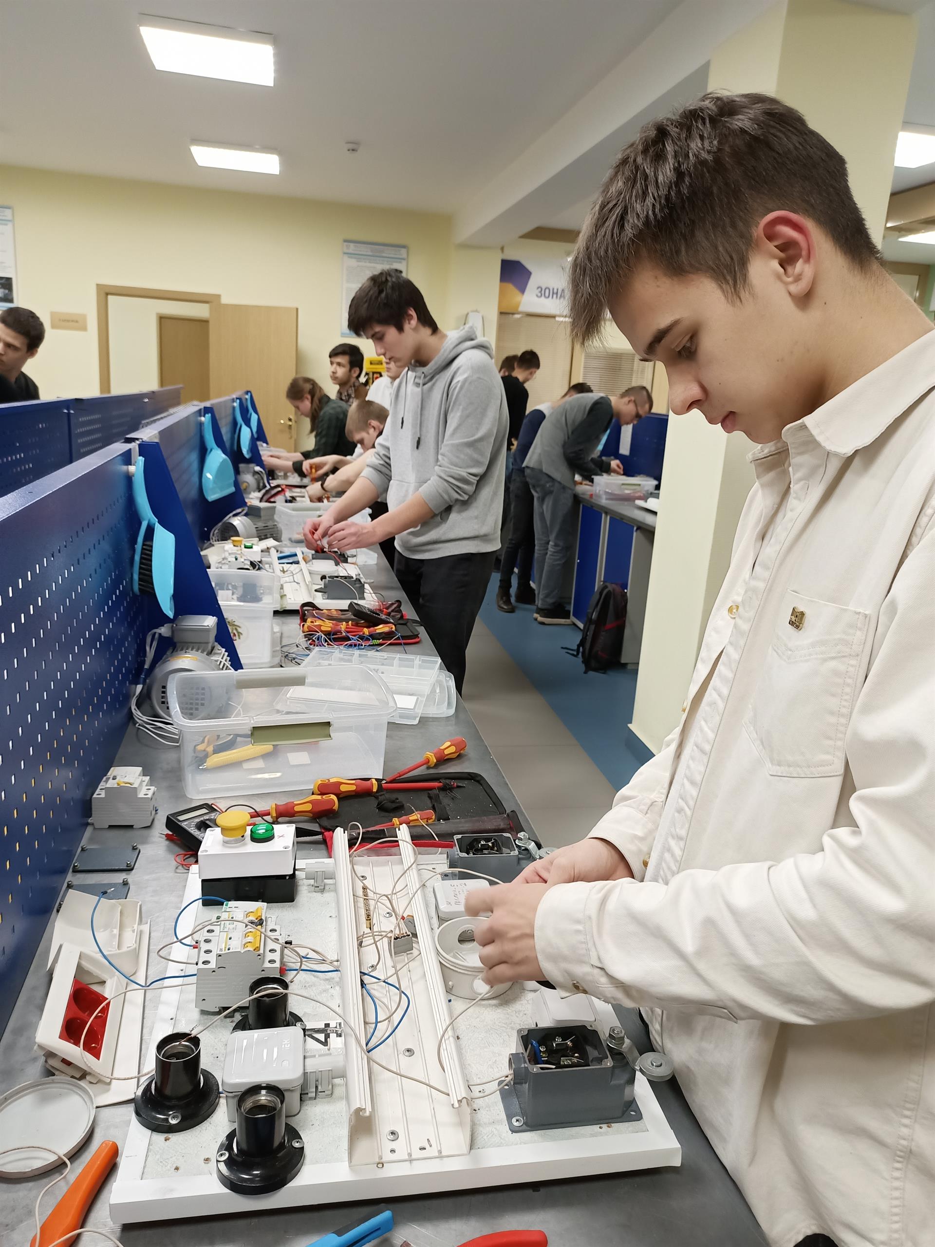 В настоящее время в Центре прикладных квалификаций «ЭЛЕКТРО СКИЛЛС» (Г-213, ЦПКЭС) и в лаборатории «Автоматизированные системы управления технологическими процессами» (Г-222, АСУТП) идут практические занятия по обучению рабочей профессии «Электромонтер по ремонту и обслуживанию электрооборудования». Бойцы студенческих отрядов закрепляют на практике теоретические знания, полученные в ходе лекций. Лекции по рабочей профессии проходят в аудиториях кафедры ЭПП. На курсах подготовки по рабочим специальностям студенты получают не только теоретические знания по профессии, но практические умения и навыки – прикладные квалификации, которые, по мнению работодателей, являются наиболее важными качествами работников. В ходе лекционных и практических занятий слушатели курсов изучают такие разделы, как «Специфика трудоустройства обучающихся в составе студенческих отрядов», «Основы экономики», «Охрана труда», «Общие сведения об электромонтажных работах», «Устройство и монтаж электропроводок», «Монтаж, ремонт и обслуживание осветительных электроустановок», «Монтаж, обслуживание, поиск и ремонт неисправностей электроустановок электротехнических комплексов и систем».