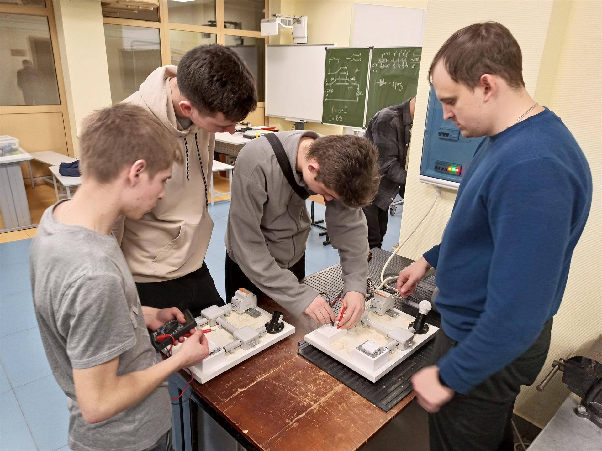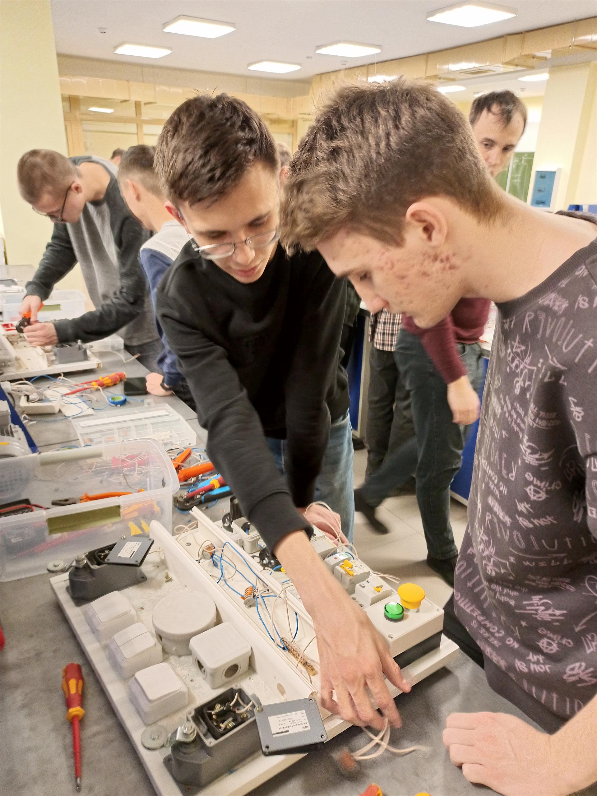 Благодаря внедрению инновационных технологий электромонтажных работ, наличию современных инструментов и расходных материалов, профессия «электрика» перестает быть только мужской, доказательство этому - наличие девушек в группах, которые на практических занятиях наравне с парнями работают с инструментами, выполняют монтаж схем освещения и цепей управления электрическими двигателями.