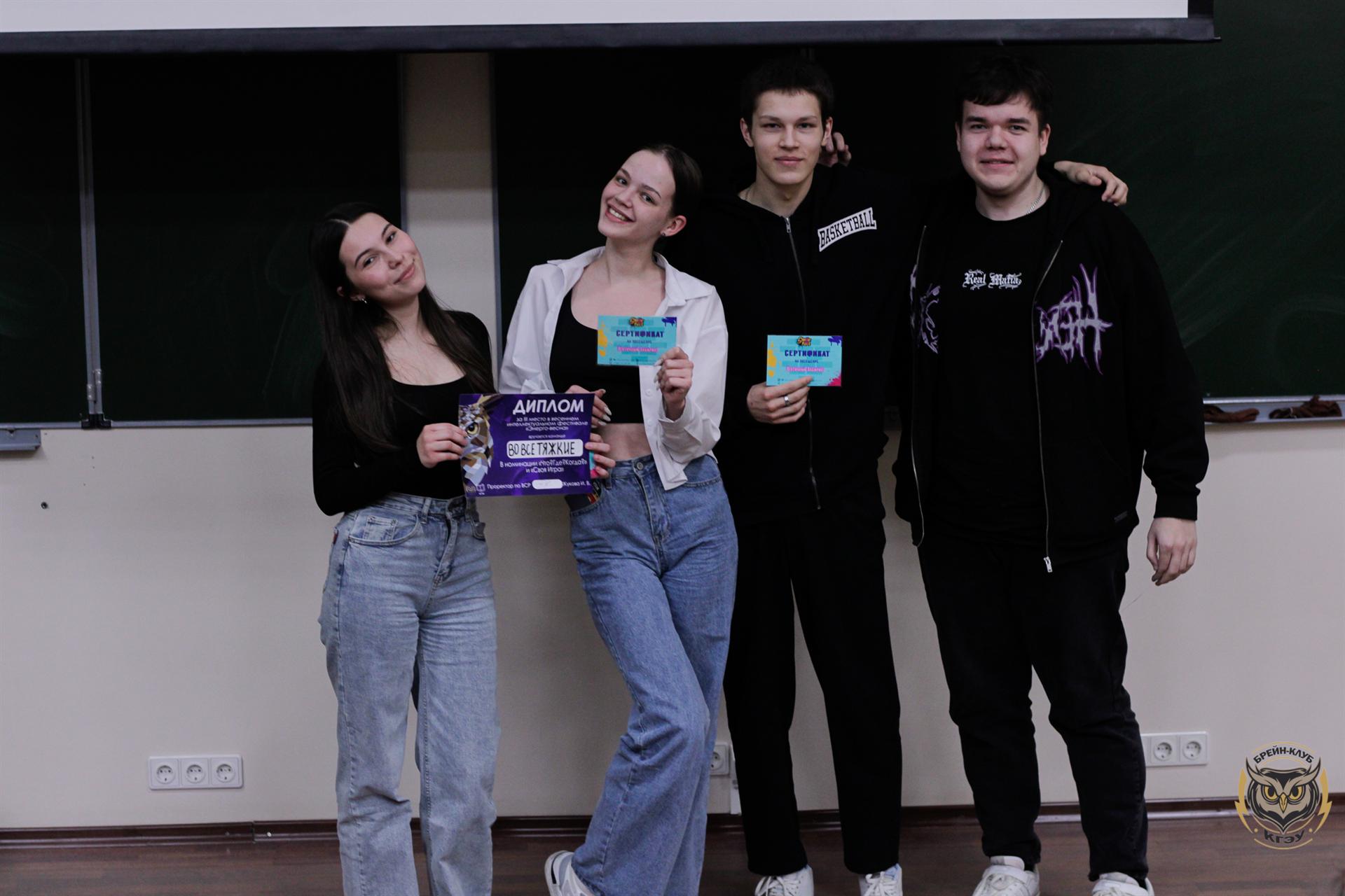 Интеллектуальные испытания в рамках фестиваля проводятся в несколько этапов. Первый этап - «Что? Где? Когда?» и «Своя игра», который состоялся 11 апреля, выиграла команда «KGEU.ru» в составе сотрудников пресс-службы КГЭУ и активистов студенческого медиацентра. Второе место заняла команда студентов Института теплоэнергетики КГЭУ «Мои любимые», «бронза» досталась команде «Во все тяжкие» Института цифровых технологий и экономики.