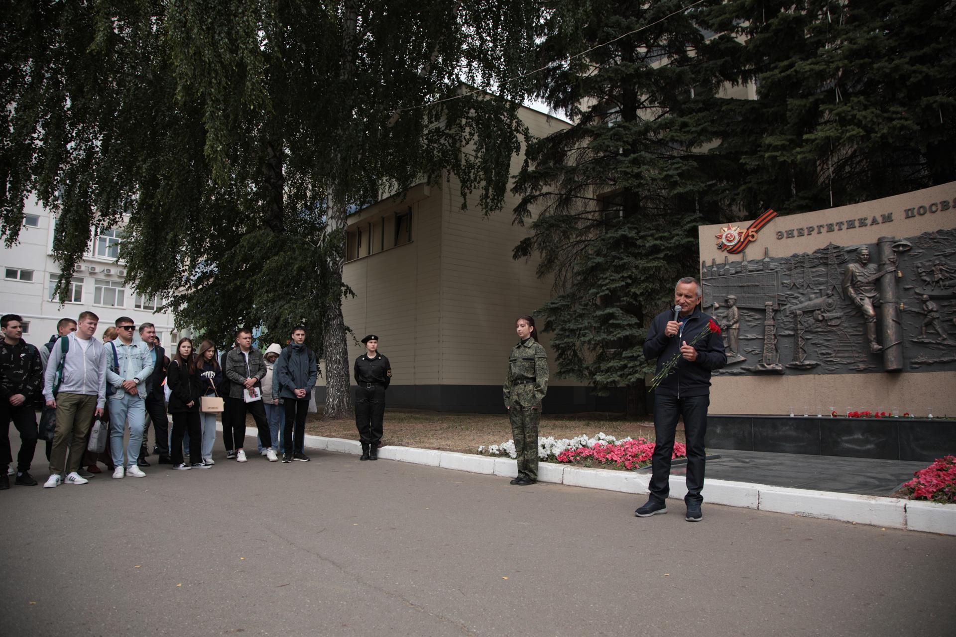 Начальник управления по воспитательной и социальной работе Гульнара Лякина рассказала собравшимся об участии энергетиков Татарстана в обеспечении нужд фронта и тыла, о событиях Великой Отечественной войны, которые были отображены в рельефной композиции «Энергетикам посвящается». Этот мемориал был установлен на территории Казанского государственного энергетического университета к 75-летию Победы советского народа в Великой Отечественной войне. Энергетика в довоенные годы только начала свое бурное развитие, но война откатила ее ход на несколько десятков лет назад.