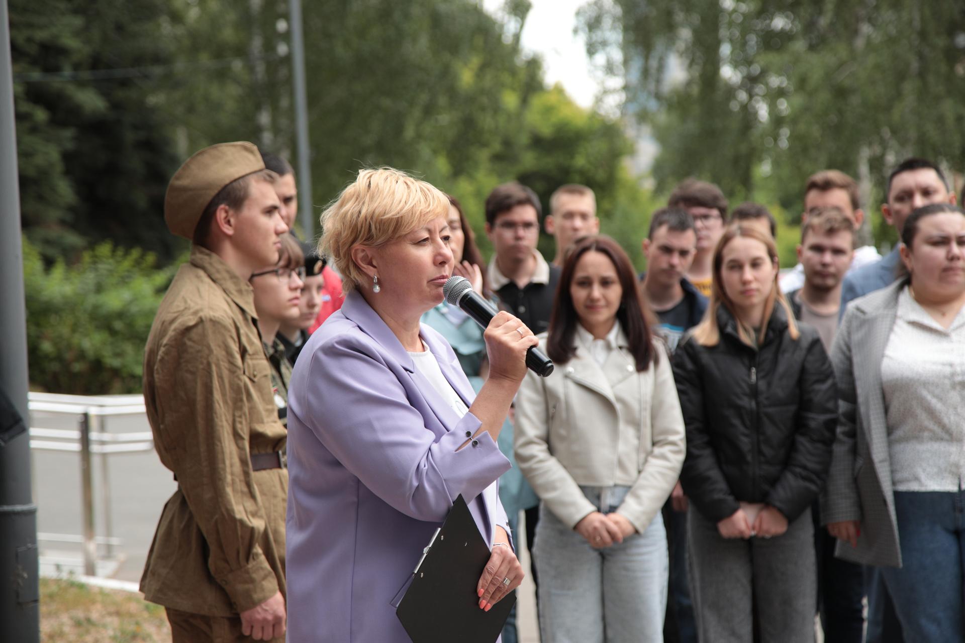 К собравшимся обратились ректор Эдвард Абдуллазянов, дочь фронтовика, энергетика, одного из основателей вуза Виктора Шибанова, доцент кафедры «Электрические станции имени В.К. Шибанова» Татьяна Лопухова, бывший начальник военной кафедры, ветеран КГЭУ Анатолий Черняков, педагог-психолог Дина Дергунова.