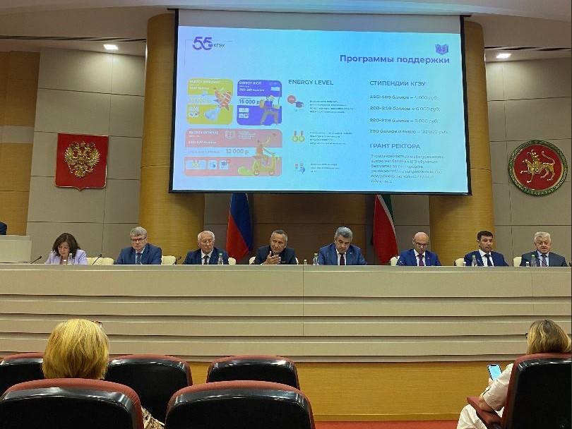 Ректор напомнил, что КГЭУ сегодня – это 5 институтов, 31 кафедра (25 из них – выпускающие), 92 образовательные программы, 3 диссертационных совета, 10 000 студентов и аспирантов из различных регионов Российской Федерации и зарубежья. Ректор особо подчеркнул, что уровень трудоустройства выпускников вуза – один из самых высоких в стране и составляет более 90 процентов.