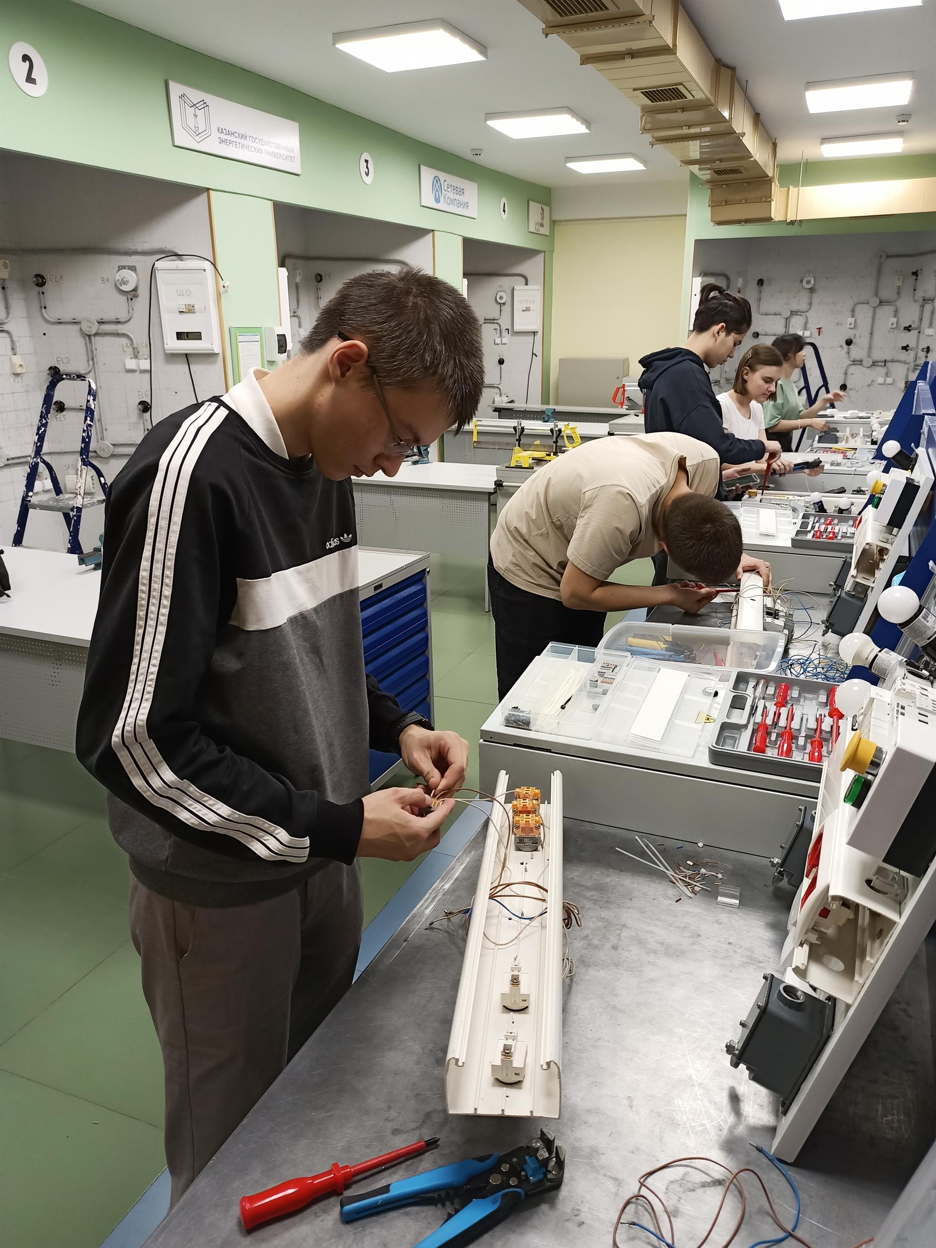 При проведении практических занятий по профессии «Электромонтер по ремонту и обслуживанию электрооборудования (3 разряда)» были задействованы современные лаборатории и мастерские КГЭУ, оснащенные профессиональным инструментом и расходными материалами: Центр прикладных квалификаций «ЭЛЕКТРО СКИЛЛС» (Г-213) и лаборатория «Автоматизированные системы управления технологическими процессами» (Г-222). Ценность этих лабораторий заключается в том, что они создавались в партнерстве с ведущими российскими и зарубежными компаниями: ОАО «Сетевая Компания», «IEK GROUP»; «Schneider Electric», федеральный дистрибьютор электротехнической и кабельной продукции – компания «ЭТМ». Сотрудничество с промышленными компаниями позволяет обучать студентов и слушателей курсов профессиональной подготовки на самом современном оборудовании и элементной базе, с которой студенты – бойцы студенческих отрядов столкнутся, работая на строительных площадках и электроэнергетических объектах нашей страны.