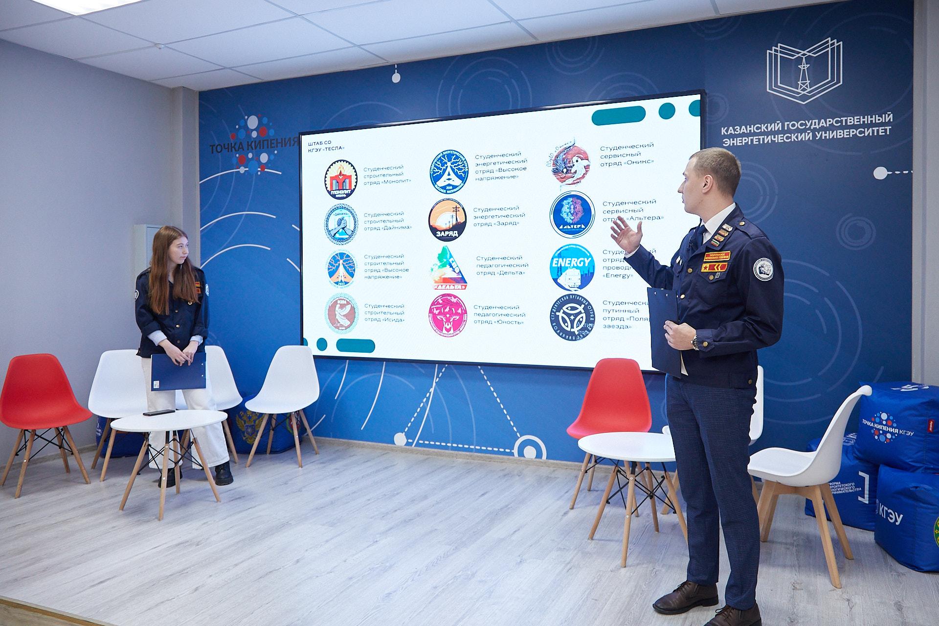 Айгуль Миннекаева рассказала о работе студенческих отрядов КГЭУ в третьем трудовом семестре, достижениях и победах. Она напомнила, что Штаб студенческих отрядов КГЭУ действует с 2015 года. На его базе существуют 12 классических отрядов, работающих по различным направлениям. Строительные отряды - «Монолит», «Дайнима», «Исида» и «Высокое Напряжение». Энергетические отряды - «Высокое Напряжение» и «Заряд». Педагогические отряды - «Дельта» и «Юность». Сервисные отряды - «Оникс» и «Альтера». Студенческий отряд проводников - «Energy» и путинный отряд «Полярная звезда». Кроме того, на базе Штаба также осуществляют свою волонтерскую деятельность два отряда снежного десанта - «Сириус» и «Резонанс». В этом году в состав ОСД «Резонанс» вошли два бойца из Республики Беларусь.
