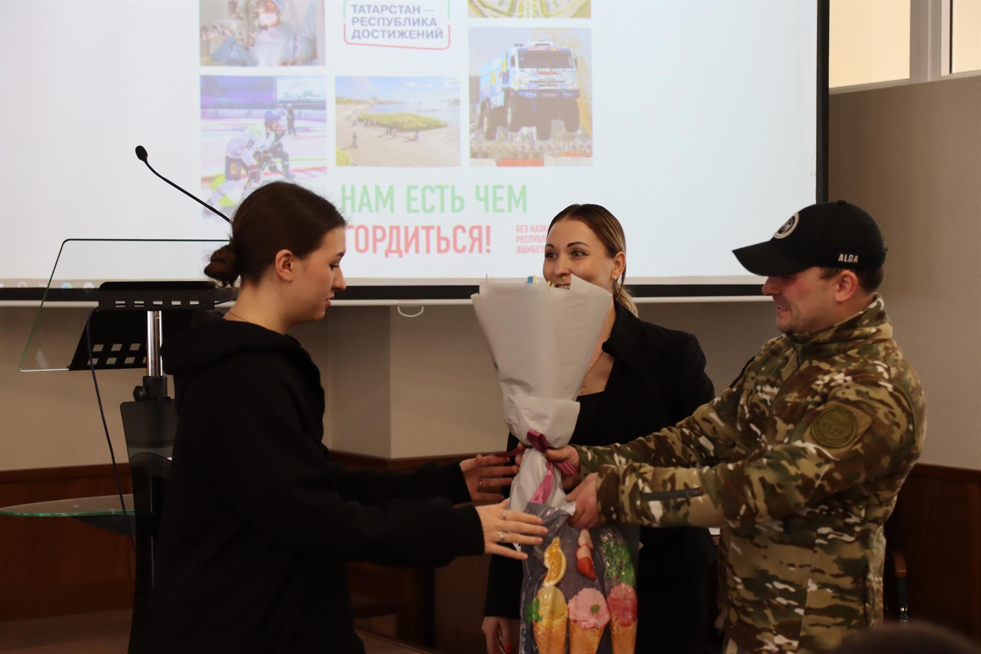 Боец приехал в родную Казань, чтобы пройти курс реабилитации после ранения, а затем снова вернется в строй. Он пообщался со студентами КГЭУ и поблагодарил их за письма поддержки, которые получали бойцы его подразделения в зоне специальной военной операции. Особенно ему понравилось послание студентки второго курса КГЭУ Елизаветы Лигай. В знак признательности боец вручил девушке букет цветов. Ректор Эдвард Абдуллазянов высказал гостю слова поддержки и пожелал ему скорейшего восстановления.