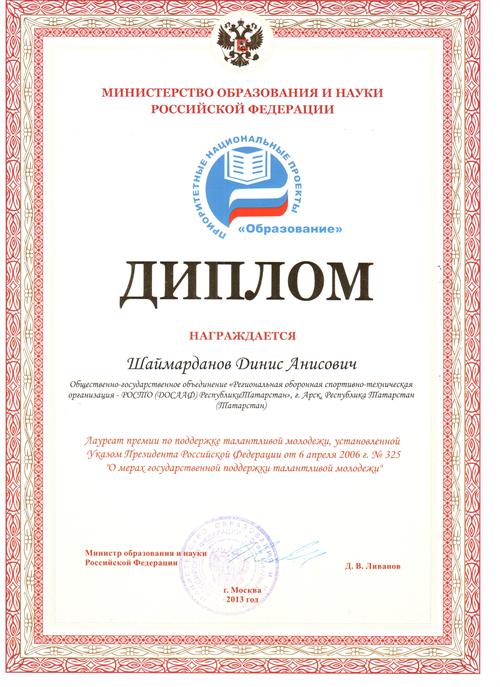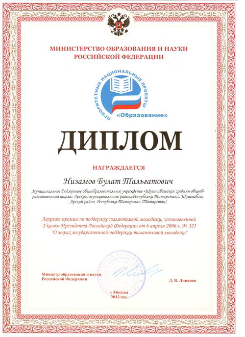 Студенты Энергоуниверситета Шаймарданов Динис (гр. ПЭ-1-11) и Низамов Булат (гр. ИВТ-2-13) получили дипломы за подписью министра образования и науки РФ Д.В. Ливанова.