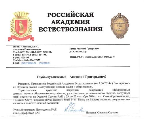 Кроме этого Российской Академией естествознания А.Г. Лаптеву присвоено Почётное звание «Заслуженный деятель науки и образования», а возглавляемая им кафедра ТВТ награждена дипломом «Золотая кафедра России». Торжественное вручение наград состоится на Осенней Сессии РАЕ в сентябре.