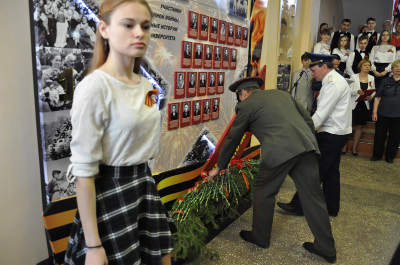Далее после минуты молчания, длительность которой отмерял метроном, почётный караул, состоящий из студентов вуза, возложил перед мемориалом памятную еловую гирлянду, оформленную георгиевской ленточкой. Вслед за караулом к монументу возложили гвоздики в память о участниках Великой Отечественной войны труженники тыла, гости мероприятия, преподаватели и студенты КГЭУ. Перед собравшимися выступили преподаватели вуза и представители общественности Казани.