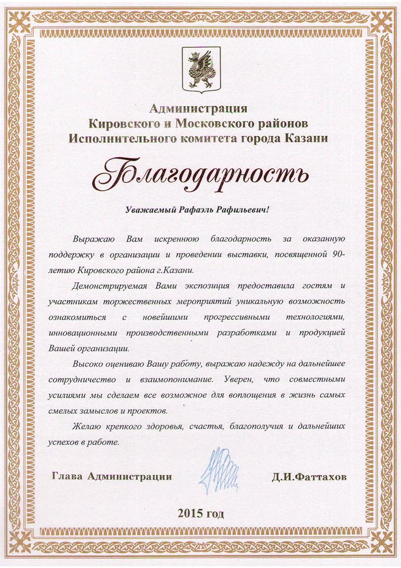 Заместитель главы Кировского и Московского районов Ирек Мансурович Арсланов выразил благодарность за оказанную поддержку в организации и проведении выставки, посвященной 90-летию Кировского района Казани. Среди награждаемых были приректор по АХР А.Д. Зиганшин, директор ЦКТЭ Р.Р. Аскаров, сотрудники ЦКТЭ Л.И. Сираев, Р.Р. Зайнуллин, М.Р. Фасхутдинов.