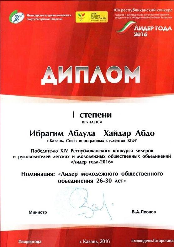 6 мая в Гранд-отеле в присутствии многочисленных именитых гостей: депутатов Государственной думы РФ М. Бариева, И. Гильмутдинова, заместителя Председателя Государственного Совета РТ Р. Ратниковой, руководителя исполнительного комитета ТРО ВПП "Единая Россия" А. Кондратьева, замминистра МДМС РТ Р. Гарифуллина и многих других состоялась красивая финальная церемония. В финал конкурса попали сразу два студента КГЭУ! Второе место в номинации Лидер молодежного объединения получила студентка ИТЭ Алина Фаздалова, а первое место занял Ибрагим Абдулла Хайдар Абдо, студент ИЭЭ.