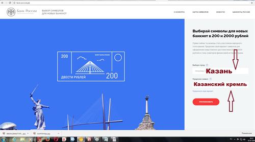 Участники голосования за выбор символов для банкнот достоинством 200 и 2000 рублей предложили изобразить Казанский кремль на будущих денежных знаках. За него проголосовали более 5000 тысяч человек, после чего Кремль появился на интерактивной карте сайта Твоя-Россия.рф.