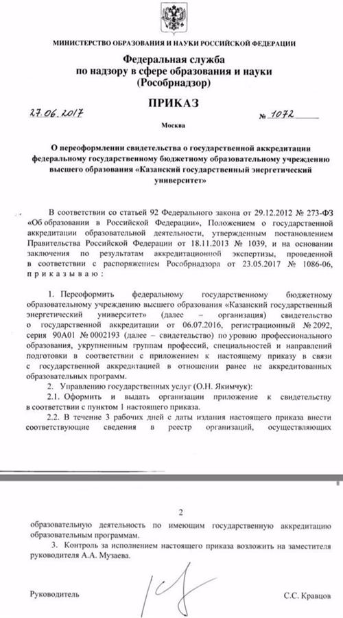 27 ИЮНЯ РУКОВОДИТЕЛЕМ РОСОБРНАДЗОРА БЫЛ ПОДПИСАН ПРИКАЗ О ПЕРЕОФОРМЛЕНИИ СВИДЕТЕЛЬСТВА О ГОСУДАРСТВЕННОЙ АККРЕДИТАЦИИ КАЗАНСКОГО ГОСУДАРСТВЕННОГО ЭНЕРГЕТИЧЕСКОГО УНИВЕРСИТЕТА.