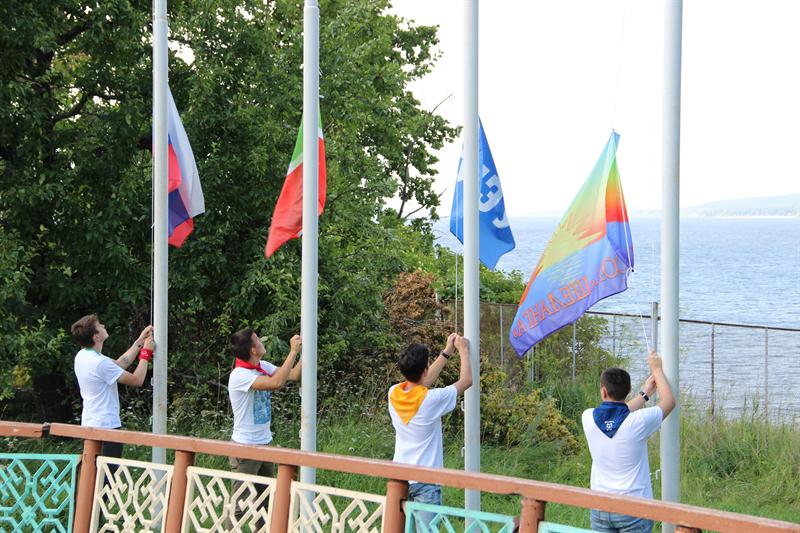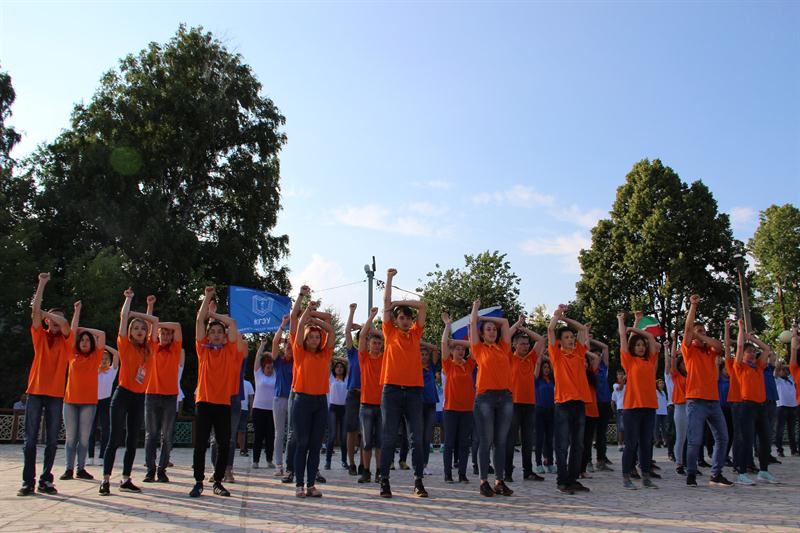 НА ОТКРЫТИИ СМЕНЫ ПОБЫВАЛ И РЕКТОР ЭДВАРД ЮНУСОВИЧ. СТУДЕНТЫ ВСТРЕЧАЛИ ГОСТЕЙ ТРАДИЦИОННЫМ ФЛЕШМОБОМ, А В ЗАВЕРШЕНИИ ПОДНЯЛИ ФЛАГИ РОССИИ, ТАТАРСТАНА И РОДНОГО УНИВЕРСИТЕТА.