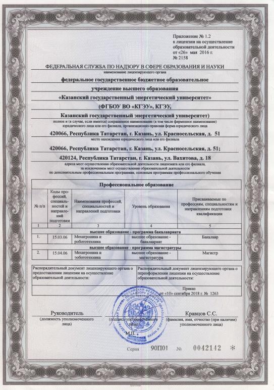 КГЭУ получил лицензию на осуществление образовательной деятельности по новым программам - бакалавриата 15.03.06 "Мехатроника и робототехника" и магистратуры 15.04.06 "Мехатроника и робототехника".