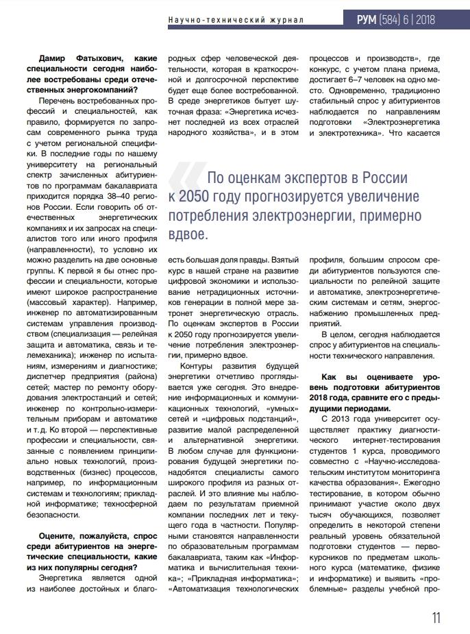На вопросы научно-технического журнала "Руководящие материалы по проектированию и эксплуатации электрических сетей" ответил проректор по интеграции с производством Дамир Фатыхович Губаев.