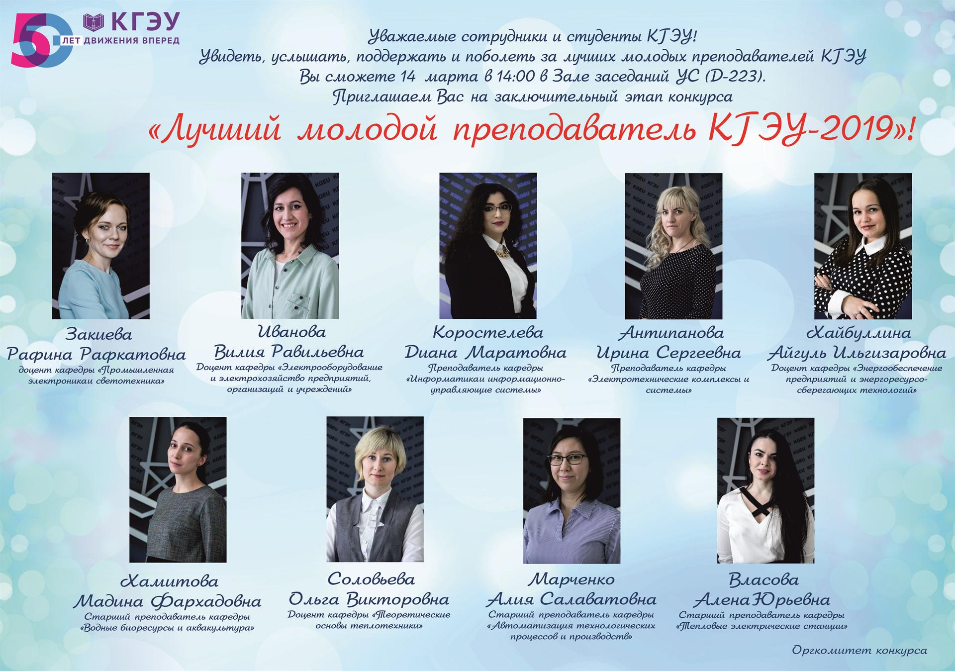Приглашаем на финал конкурса «Лучший молодой преподаватель КГЭУ – 2019», который состоится 14 марта в 14.00 в Большом зале Ученого совета (Д-223).