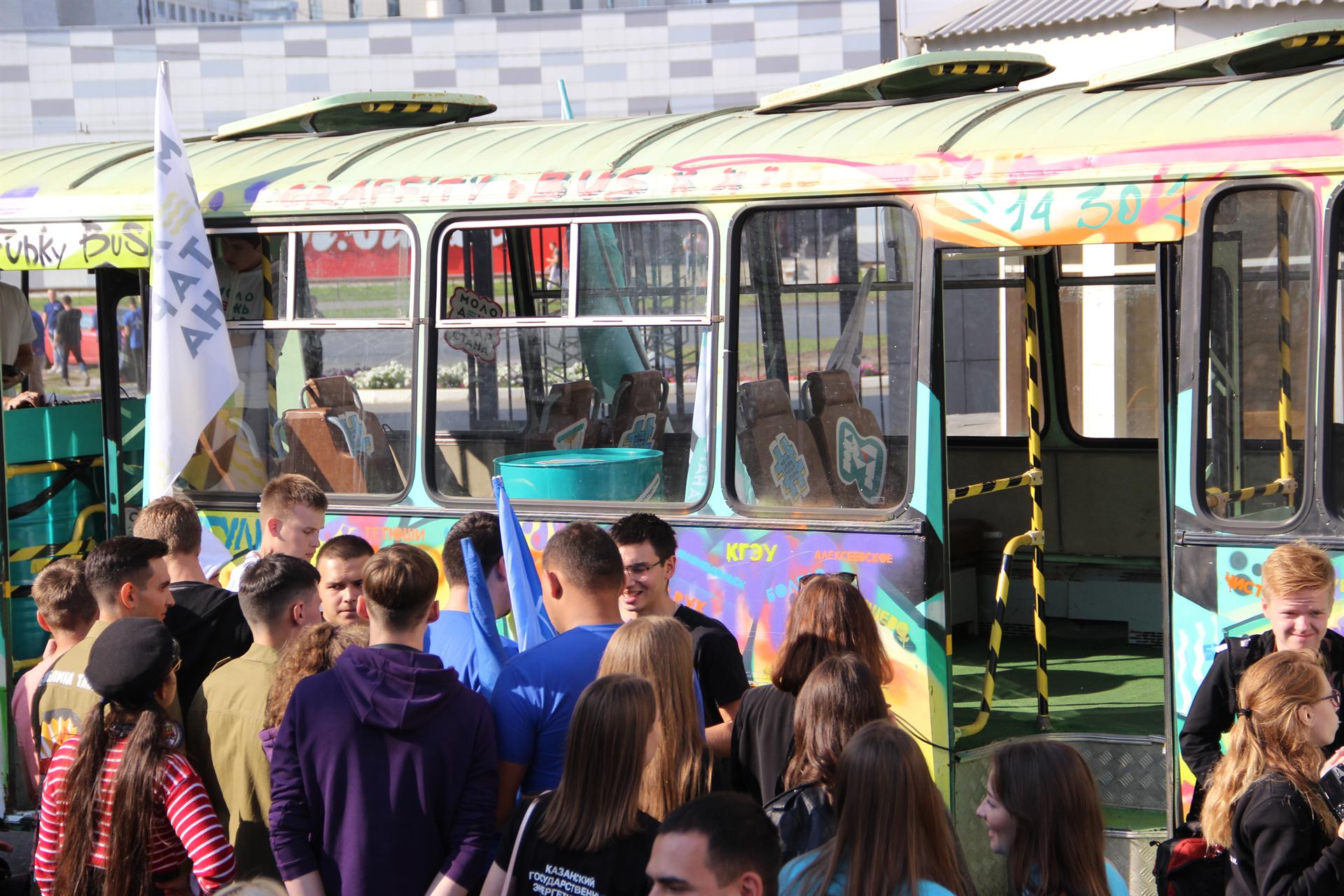 Студенты КГЭУ баллончиком нанесли название вуза на автобус, а также расписались на рупоре.